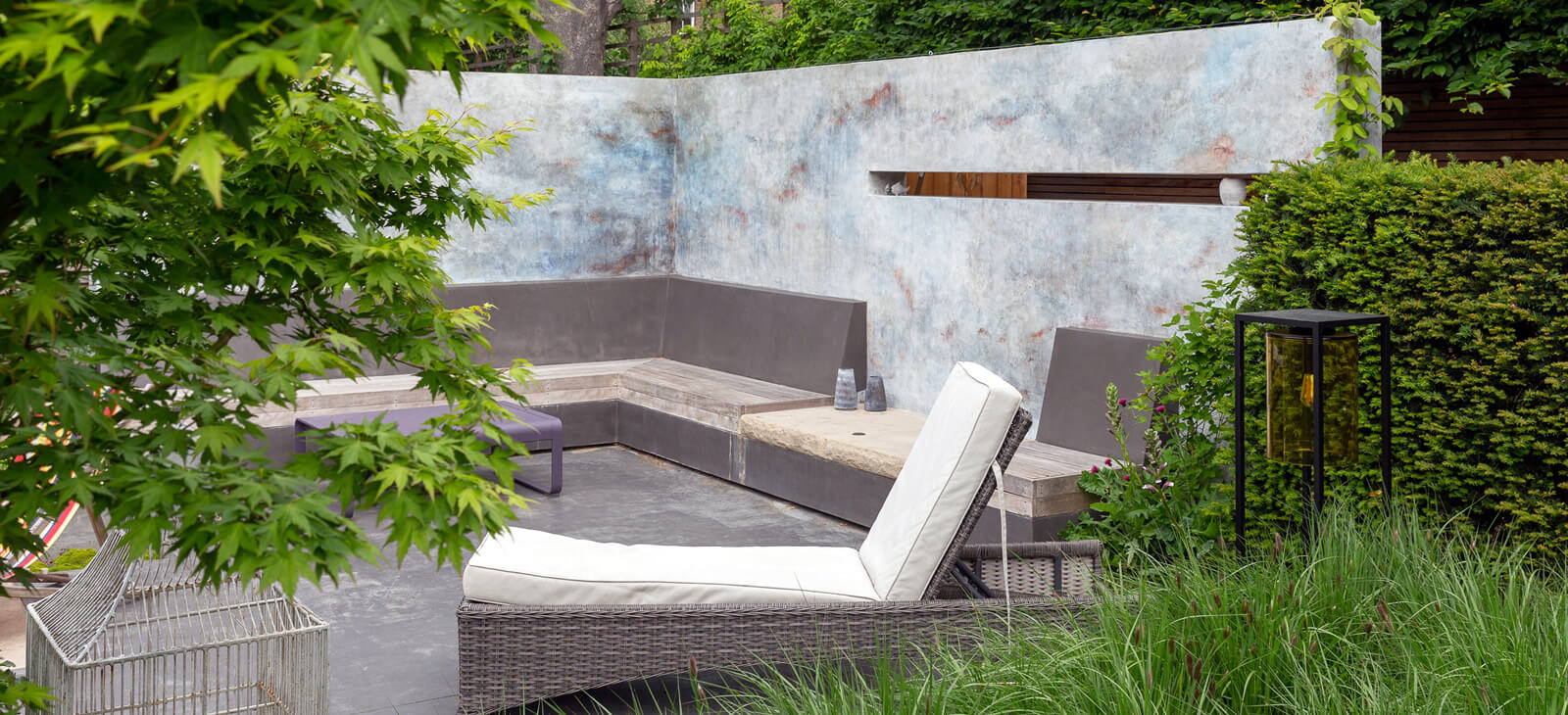 Large rugged blocks of York stone are used as elegant floating steps to the two terraces. Geometric yew volumes contrast with masses of flopping hydrangeas while mature trees, chosen for their spring blossoms and vivid autumn colours lead the eye to the back of the garden. A pair of hand-painted walls create a focal point around the polished concrete terrace.