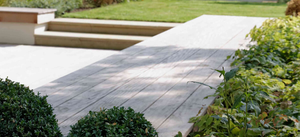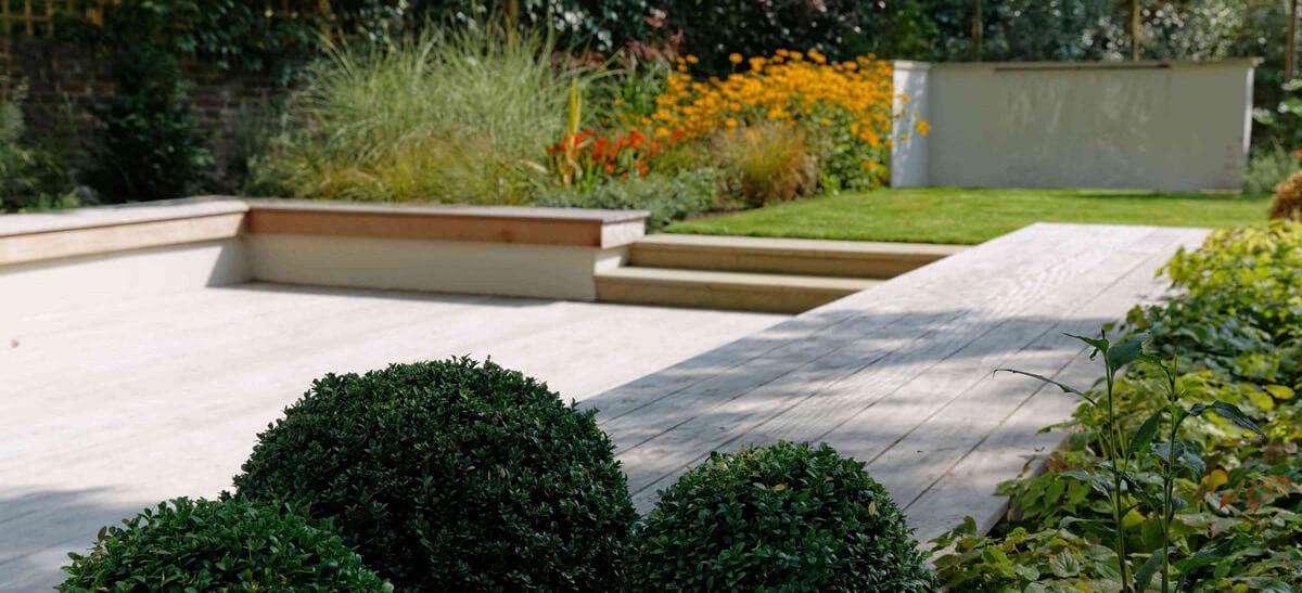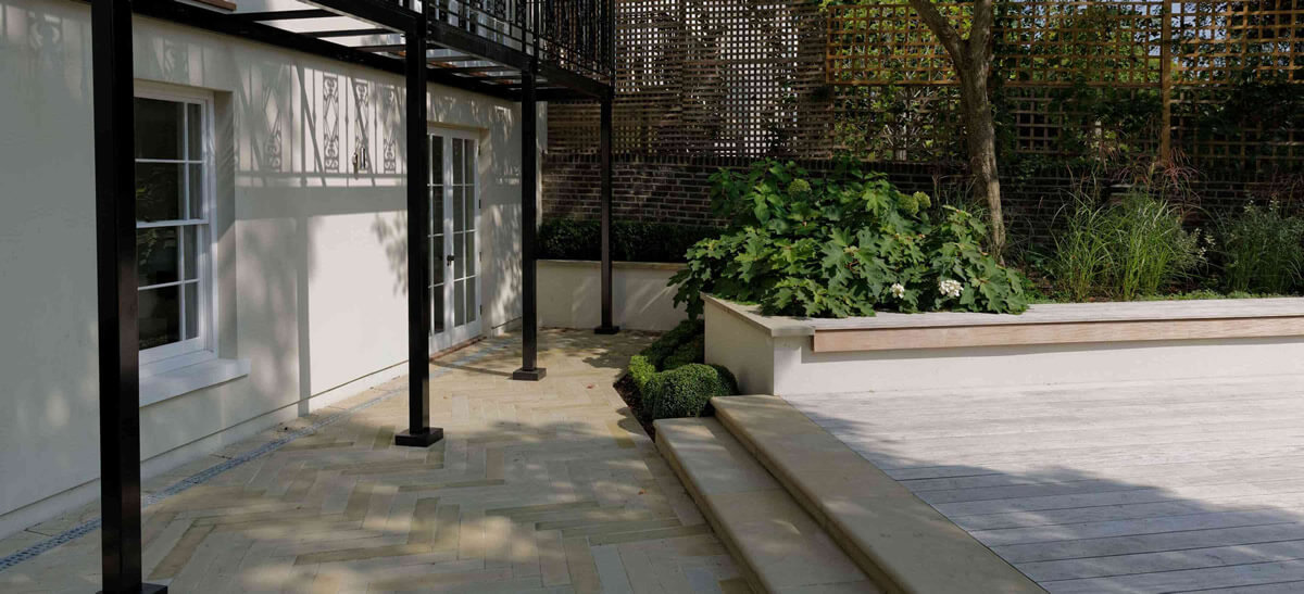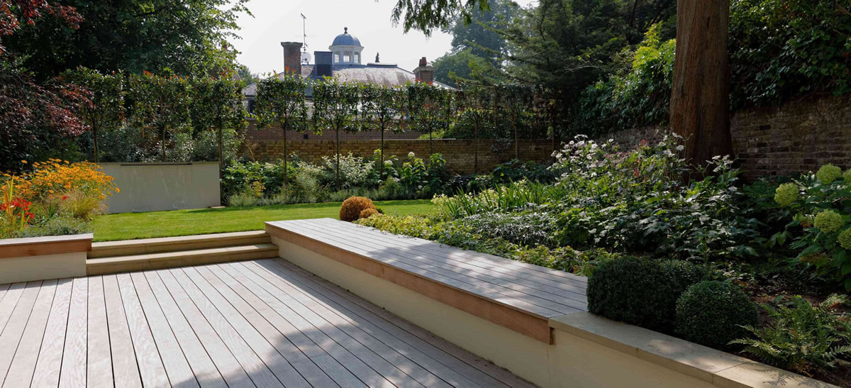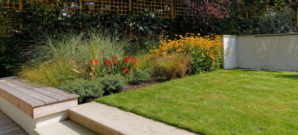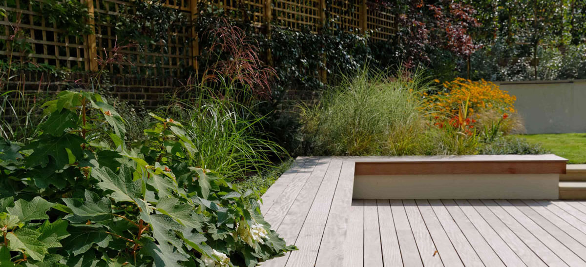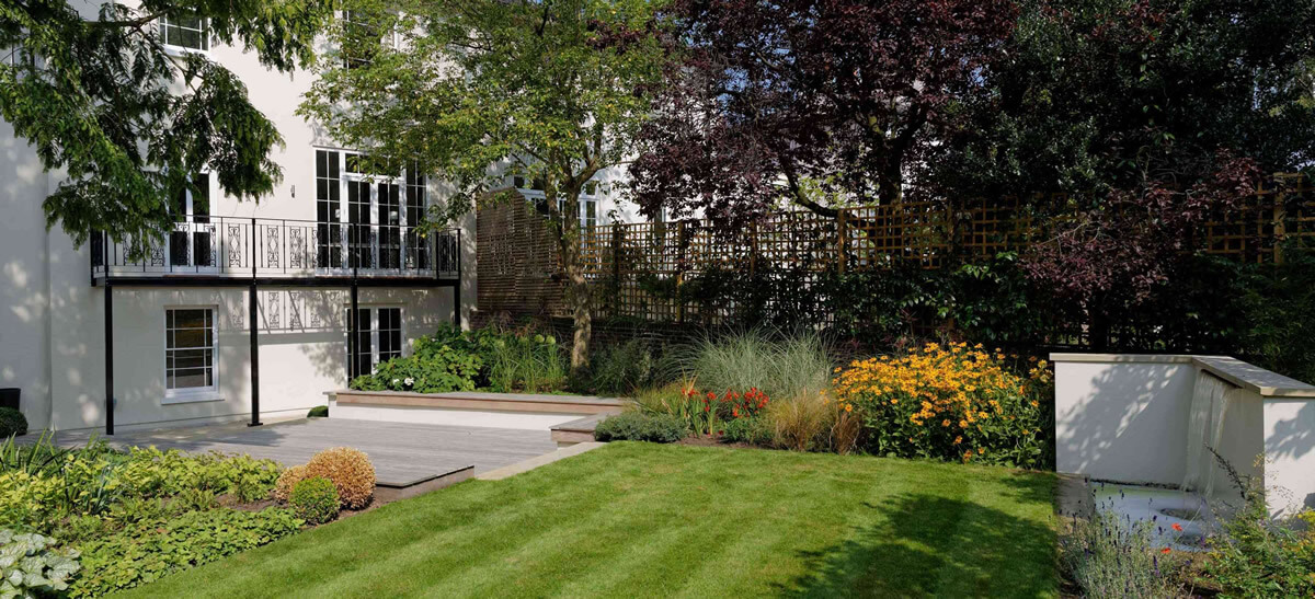 The eye-catching, herringbone stone terrace leads up to the decking and onto the expanse of lawn. The bold planting colour scheme adds interest at the rear of the garden, alongside the large water feature. Pleached trees along the boarder were selected to provide screening.