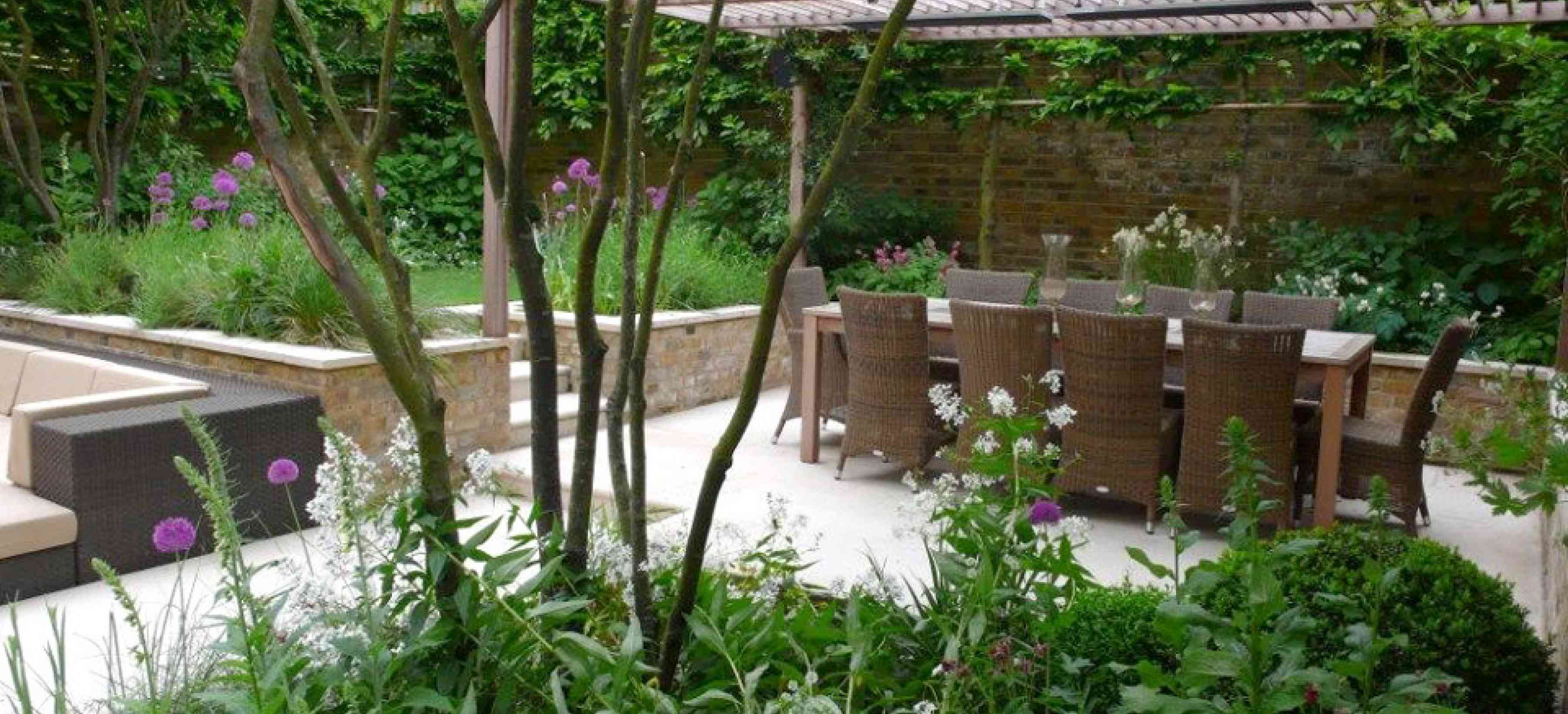A high-end garden in Central London, using sawn Portland Stone and the construction of a bespoke trellis and pergola. Large specimen trees (craned into the garden, over the house) compliment the herbaceous planting..