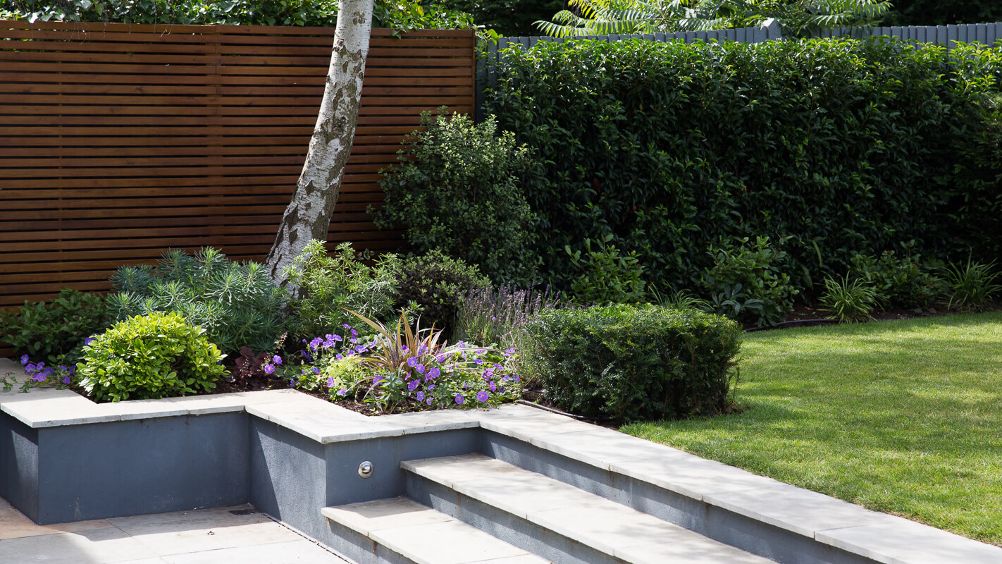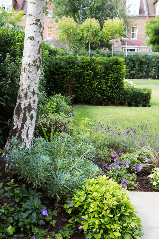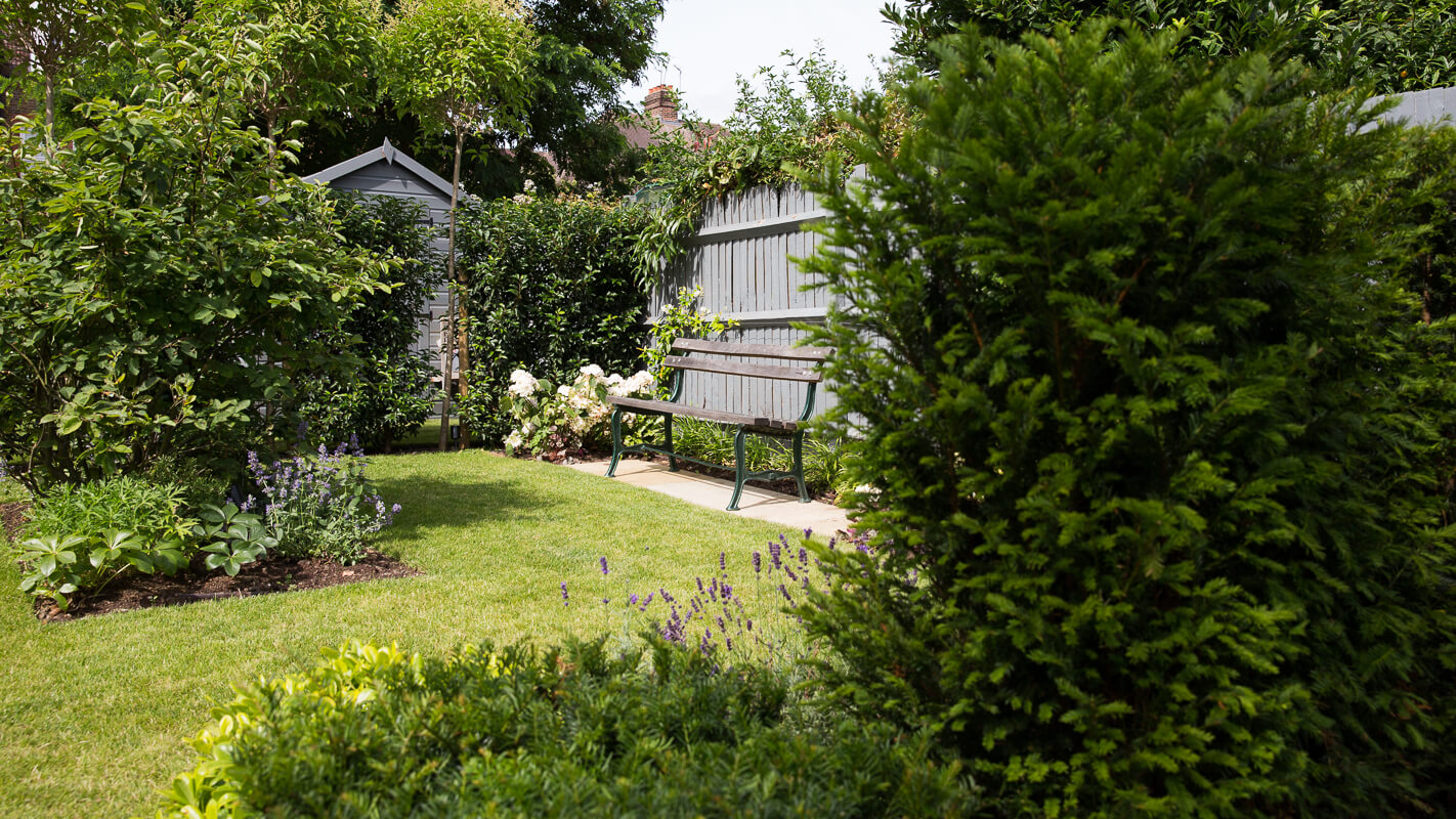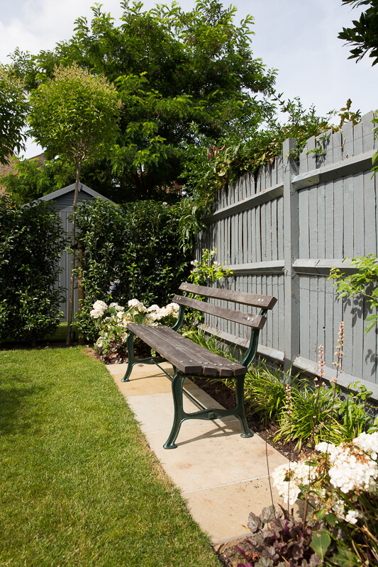 Good size family garden, with plenty of lawn to accommodate outside play. Year-round interest created with stepped- yew hedging which also helps to create separate areas within the garden, for seating and entertaining. The classic colour palette of green, white hydrangeas and purple geraniums ensure there is colour to enjoy throughout the year.