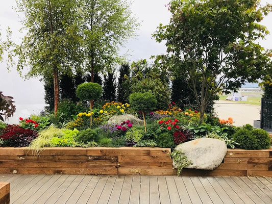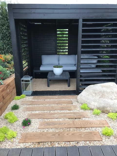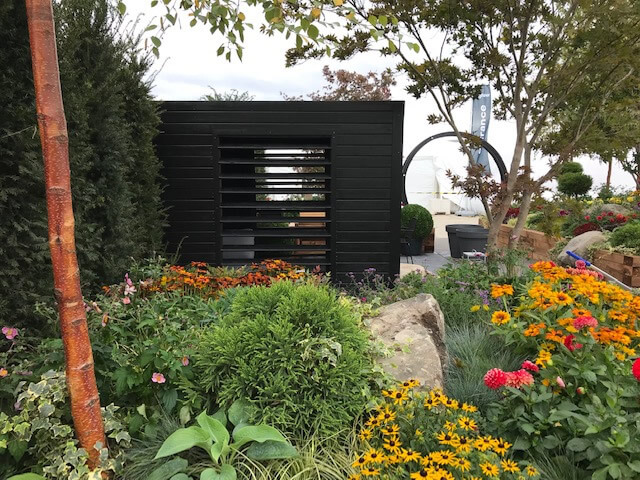 A show garden at Farnborough for Kingfisher to exhibit the range of garden materials, planting and furniture available for the public to buy at B&Q.