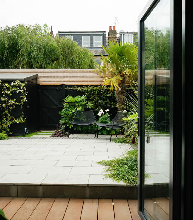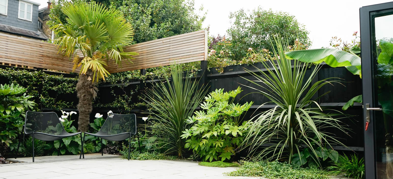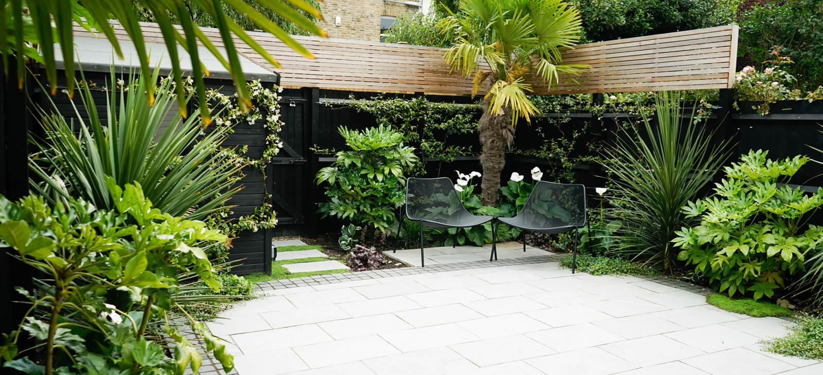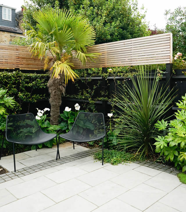 The black painted boundary fences are a perfect backdrop to the lush tropical, architectural planting. The basalt sets form a modern boarder between the paving and the planting beds. Wooden decking joins the kitchen to the small step-up to the courtyard paving. Passion Flower and evergreen jasmine successfully providing a green boundary screening.