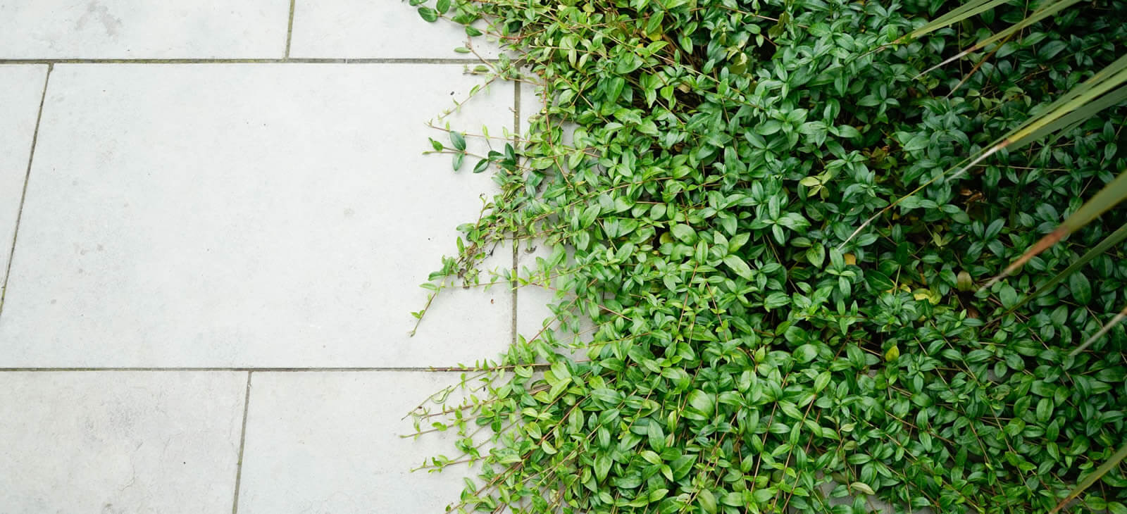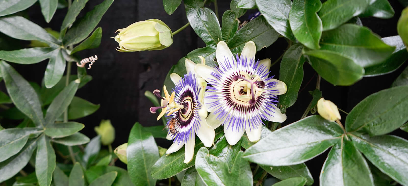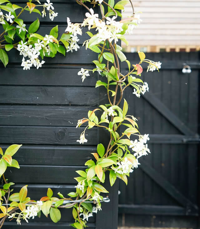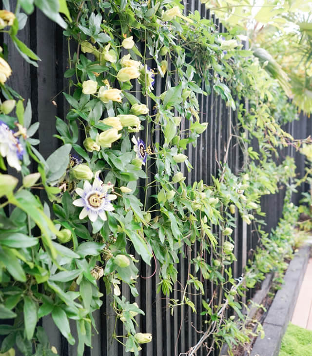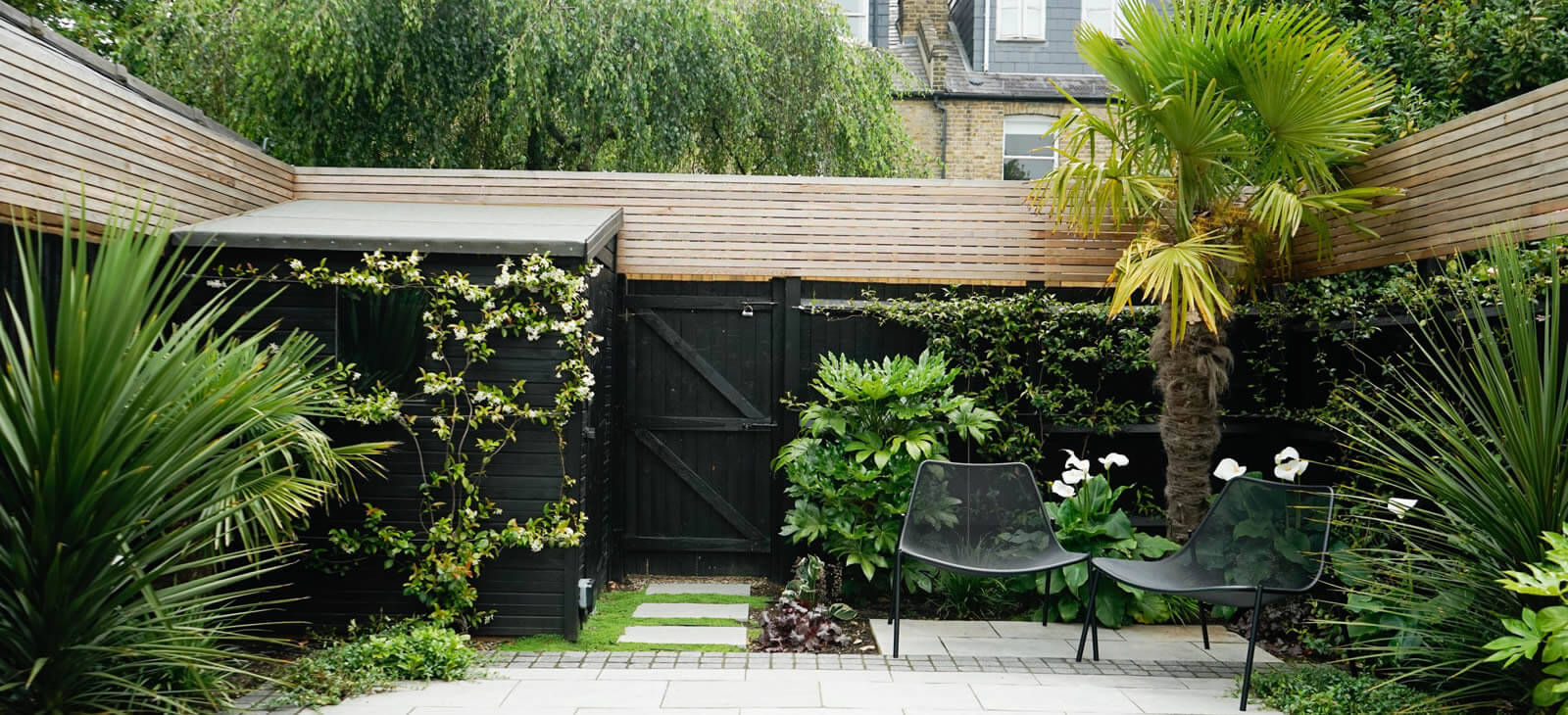 The black painted boundary fences are a perfect backdrop to the lush tropical, architectural planting. The basalt sets form a modern boarder between the paving and the planting beds. Wooden decking joins the kitchen to the small step-up to the courtyard paving. Passion Flower and evergreen jasmine successfully providing a green boundary screening.