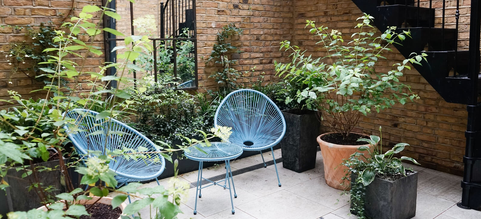 Shade-loving plants in the black planters complement the black spiral staircase, window frames and exterior mirror.