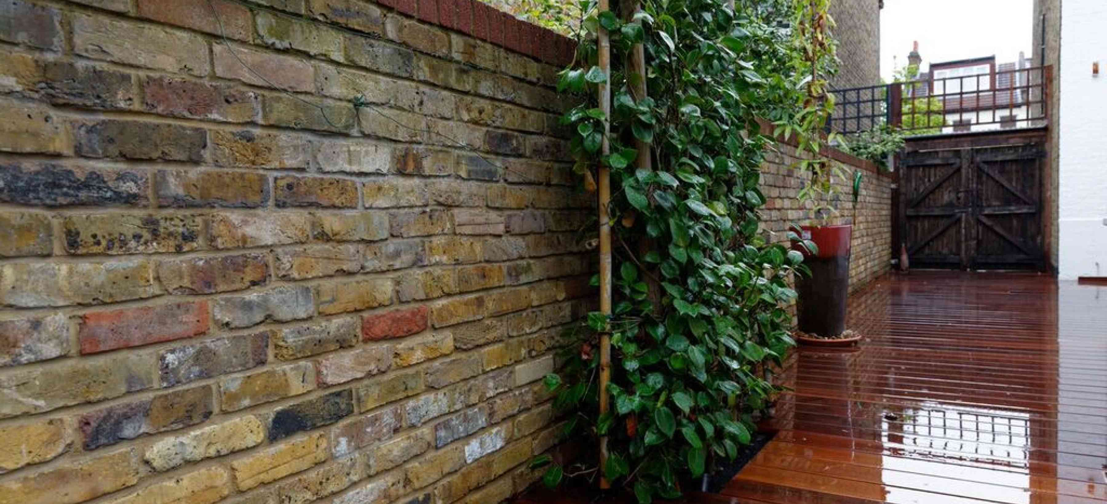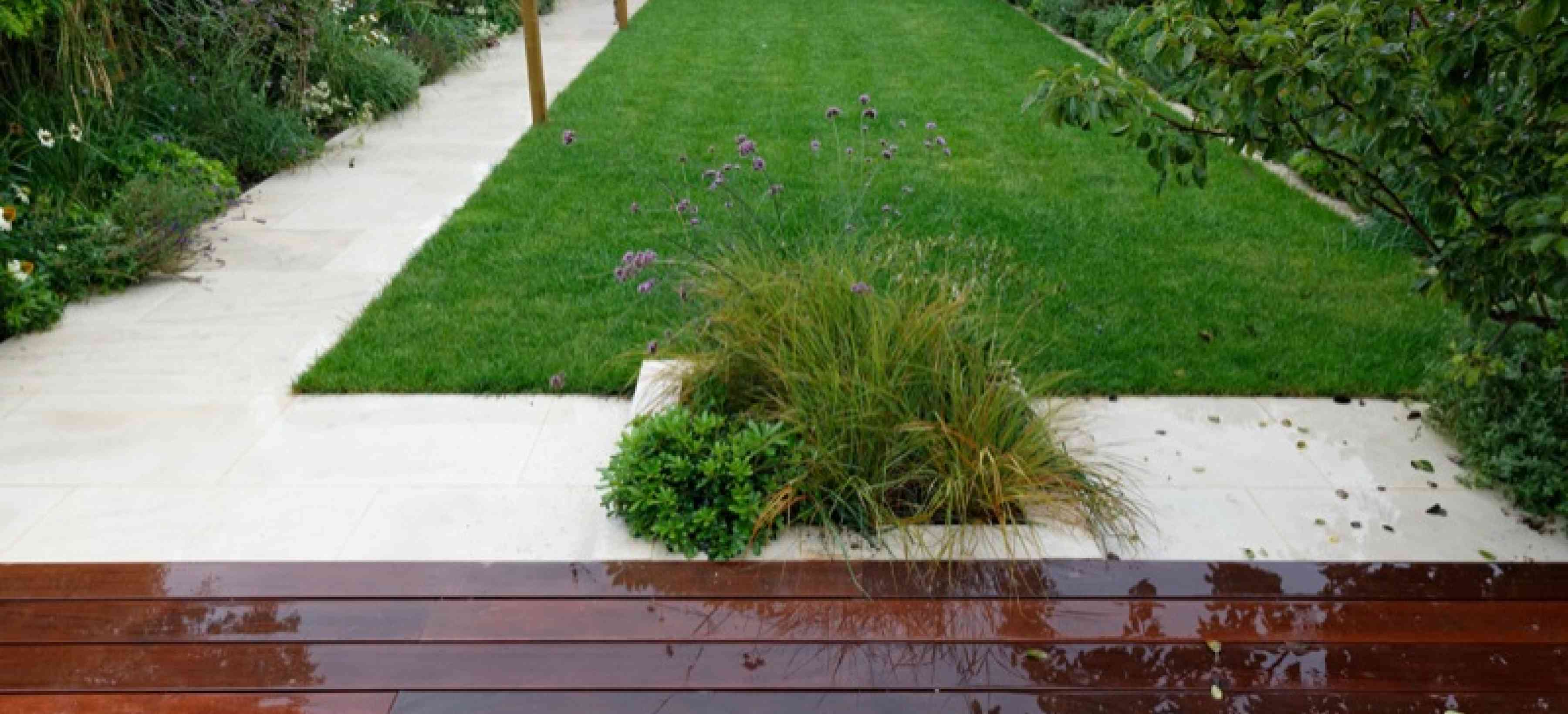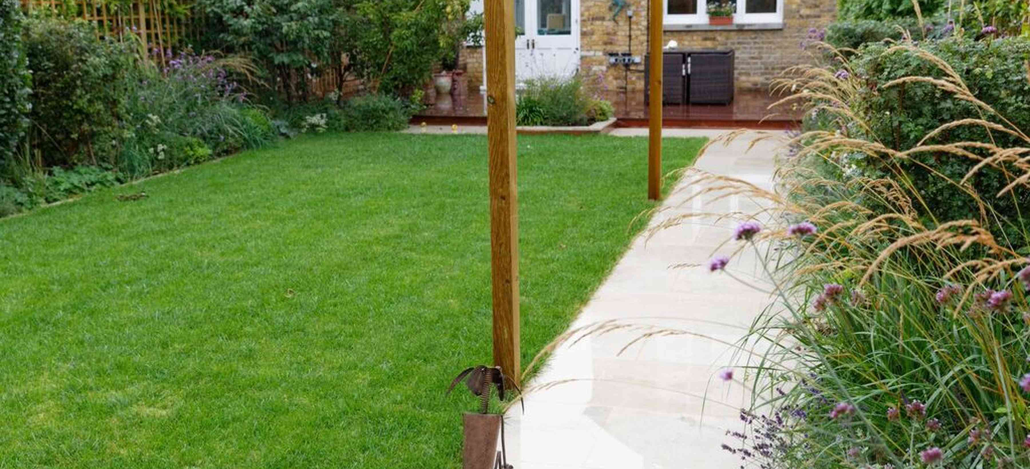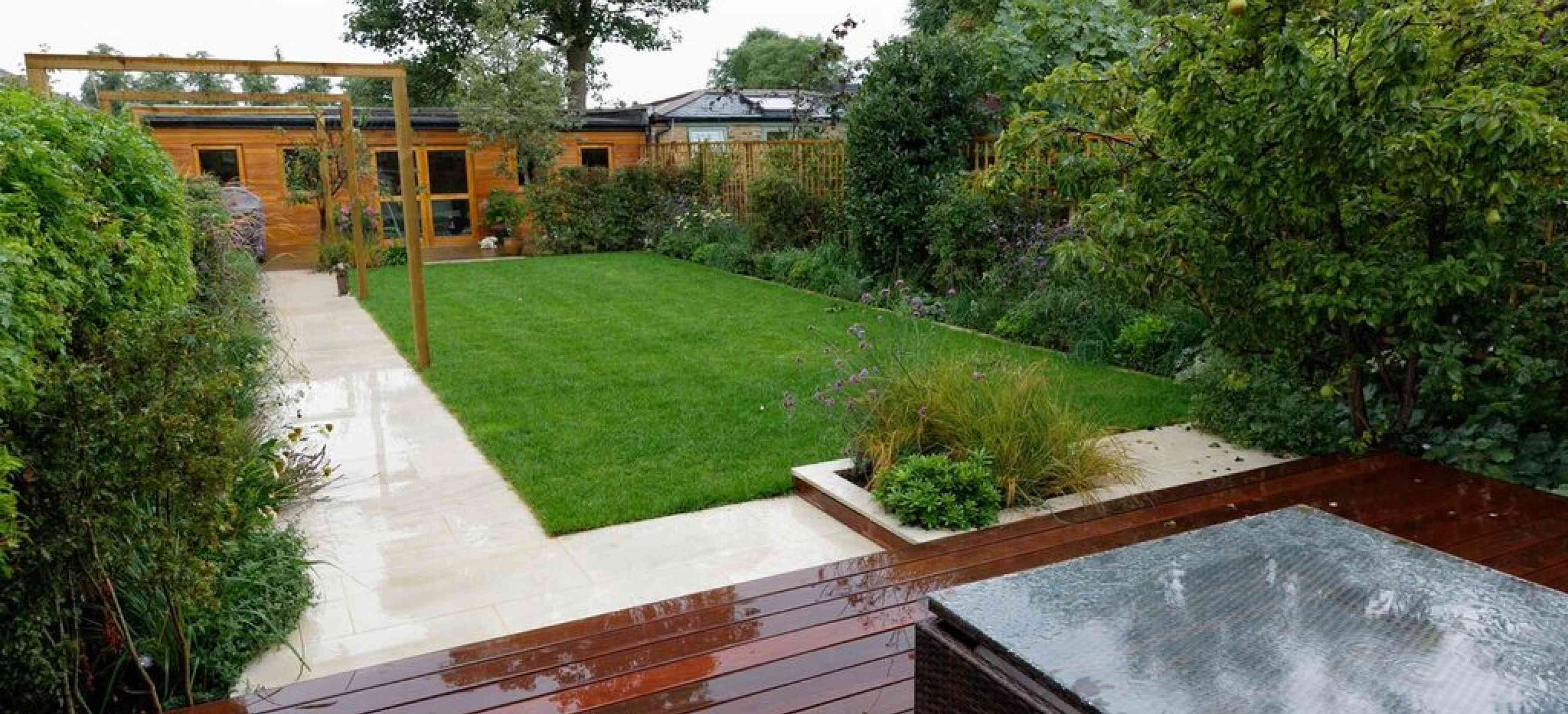 This large city garden, in Wimbledon, South West London includes hardwood decking and a striking stone path leading to the rear garden and garden studio.