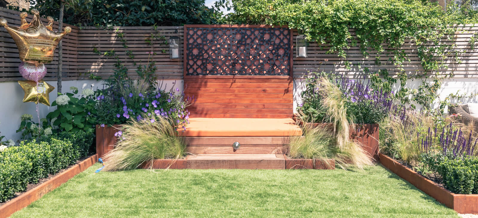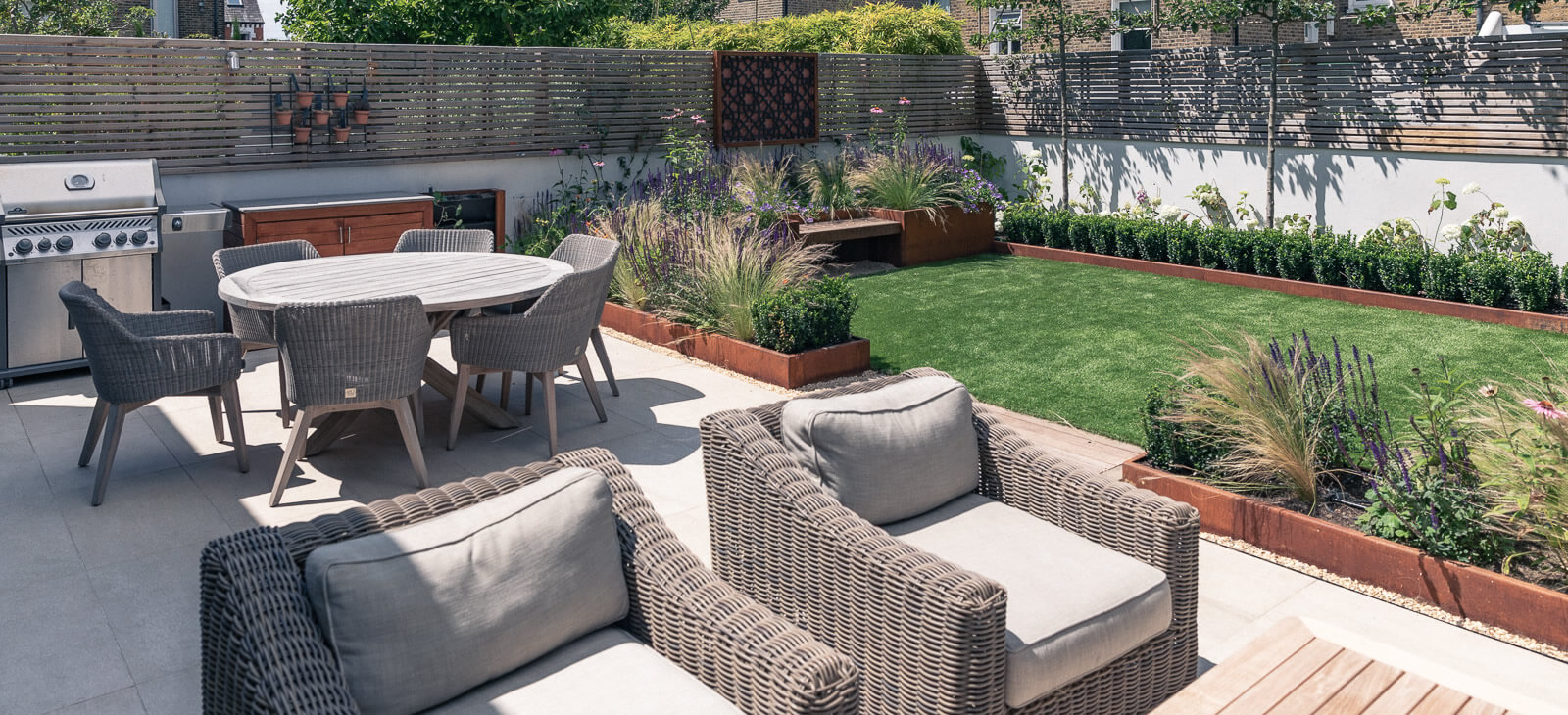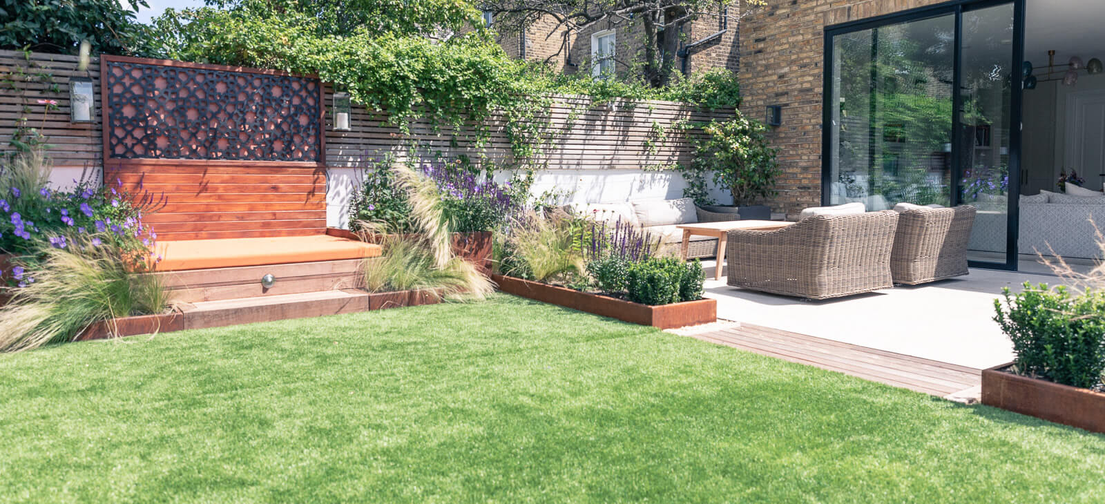 The stone terrace was retained but corten raised planters installed with a cheerful yet elegant planting scheme. The super-size, in-built day bed can accommodate the young children the family dog and more, with the option of a separate seating area for relaxing and entertaining.