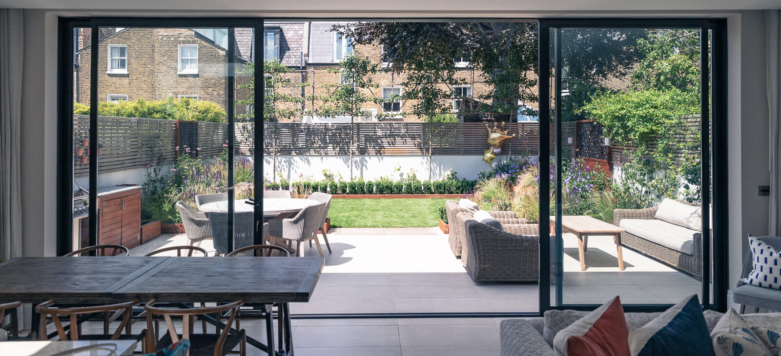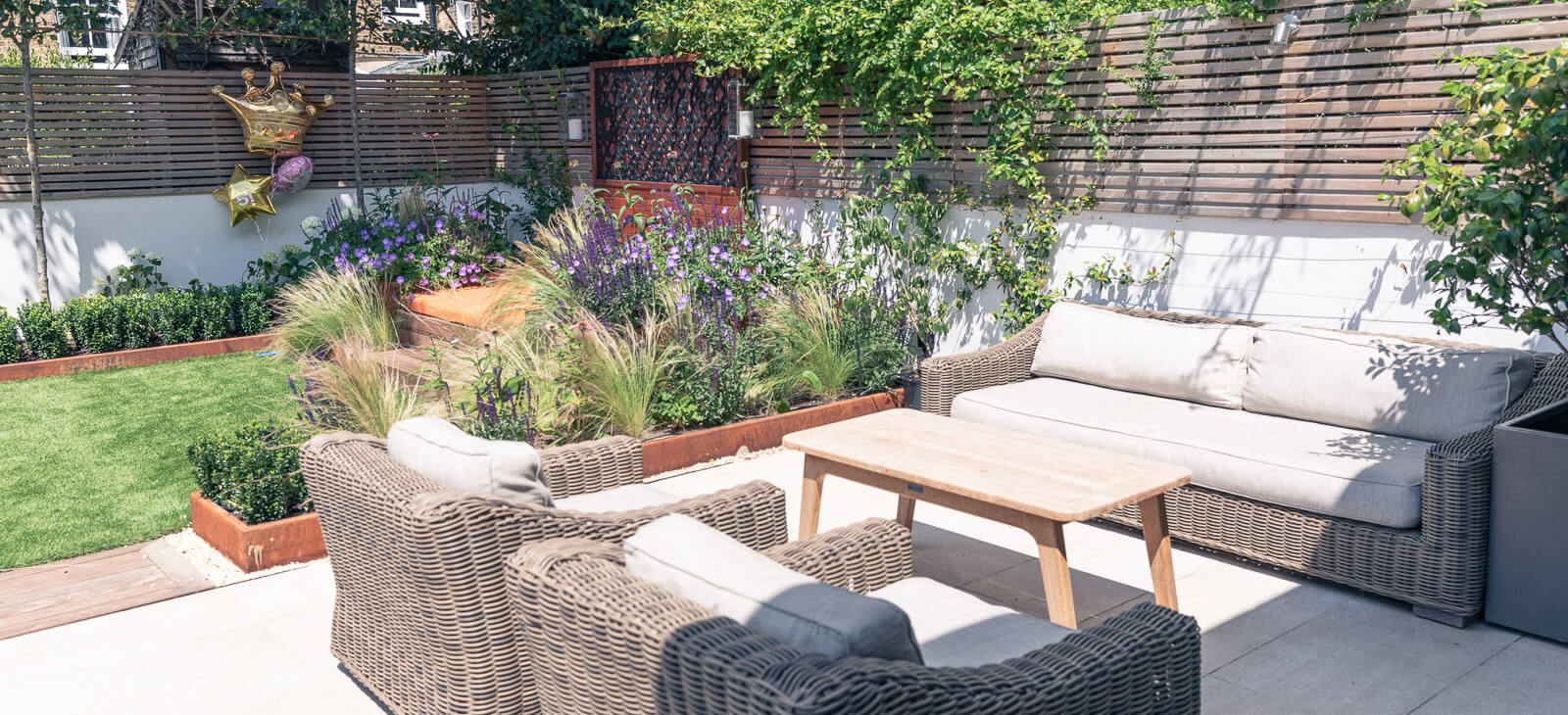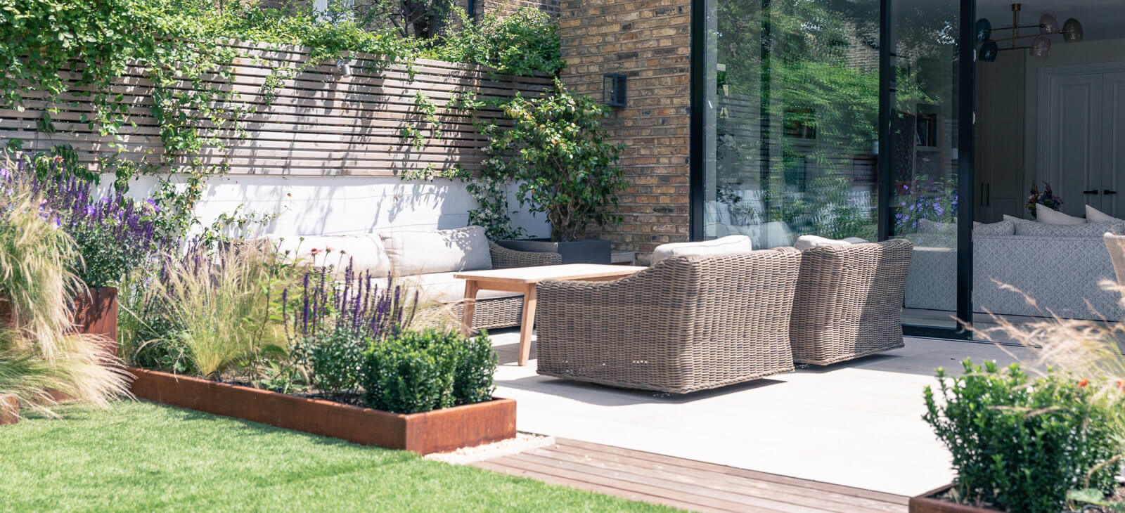 The stone terrace was retained but corten raised planters installed with a cheerful yet elegant planting scheme. The super-size, in-built day bed can accommodate the young children the family dog and more, with the option of a separate seating area for relaxing and entertaining.