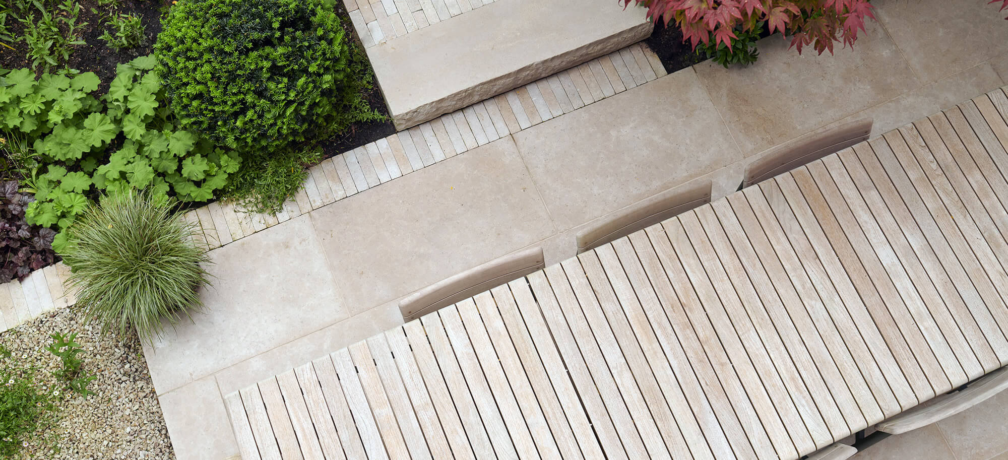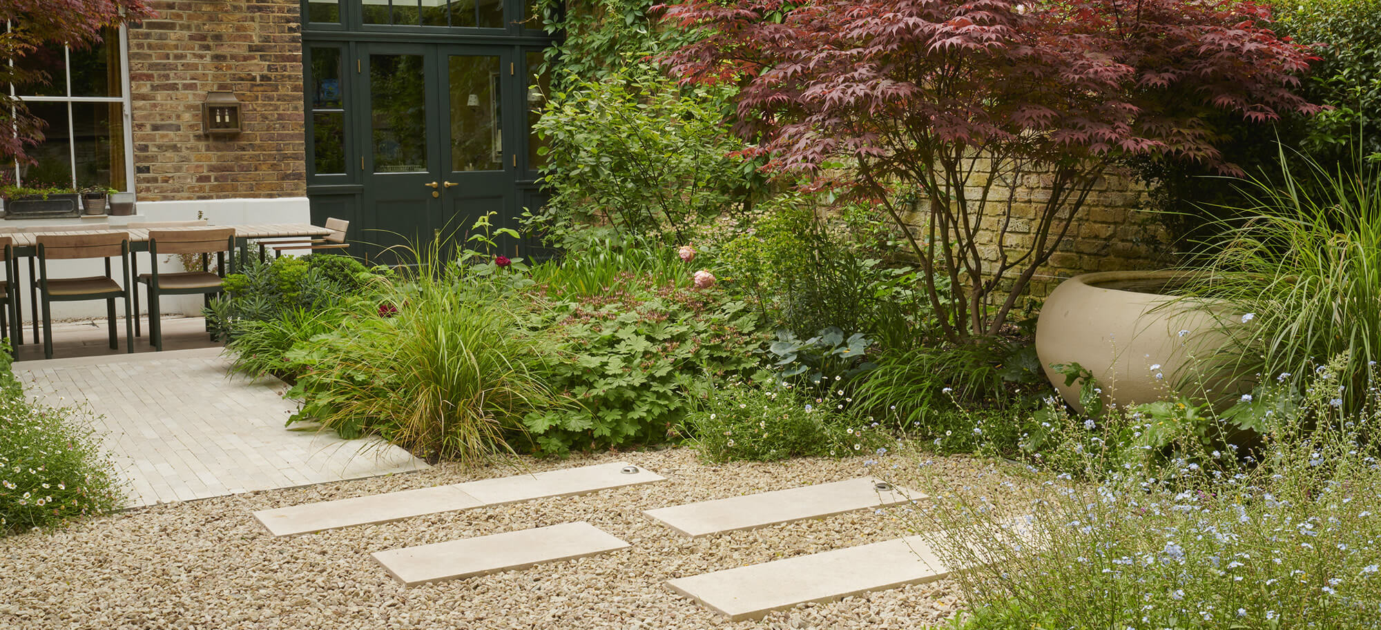 With a dining area close to the house and relaxed seating at the back on a raised deck. Clay pavers complement the stone and gravel to give a harmonious feel to the overall garden. A combination of evergreen and perennials with mature trees ensure privacy and all-year round interest..
