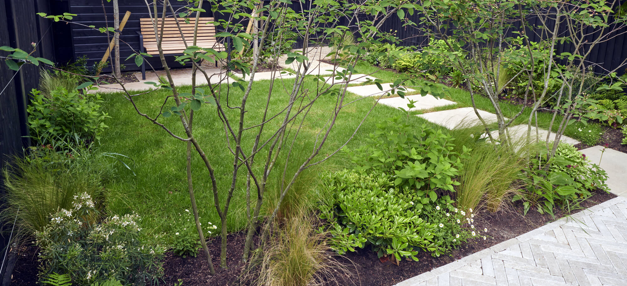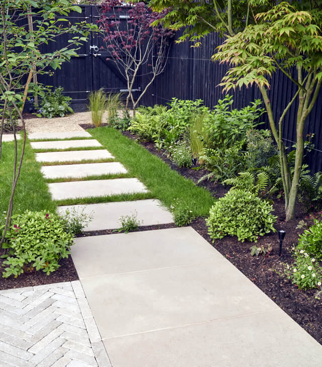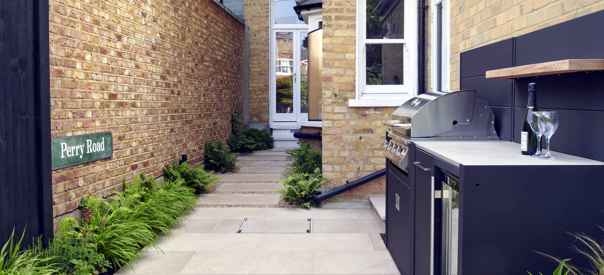 By designing the outdoor kitchen against the side return, this makes the most of this otherwise unused space and leaves the garden available to enjoy. The Grillo kitchen houses an integrated barbecue, fridge and storage. The natural stone stackers define the dining area as well as provide interest and variation to the patio. Painting the fences and shed in black helps define the space, adds a contemporary look and enhances the colour of surrounding planting. The stepping stones through the lawn provide access to the discreet shed and the back gate. The planting is a complementary mix of traditional herbaceous options such as erigeron, lavender and multistem amalanchier, with a subtle Japanese influence of the acer and added water feature.