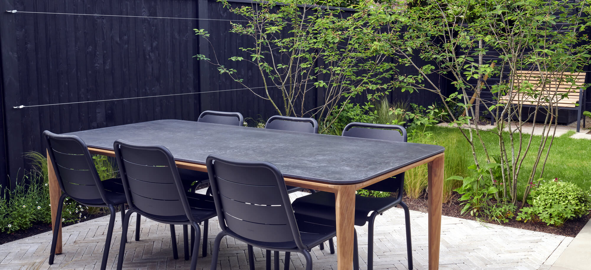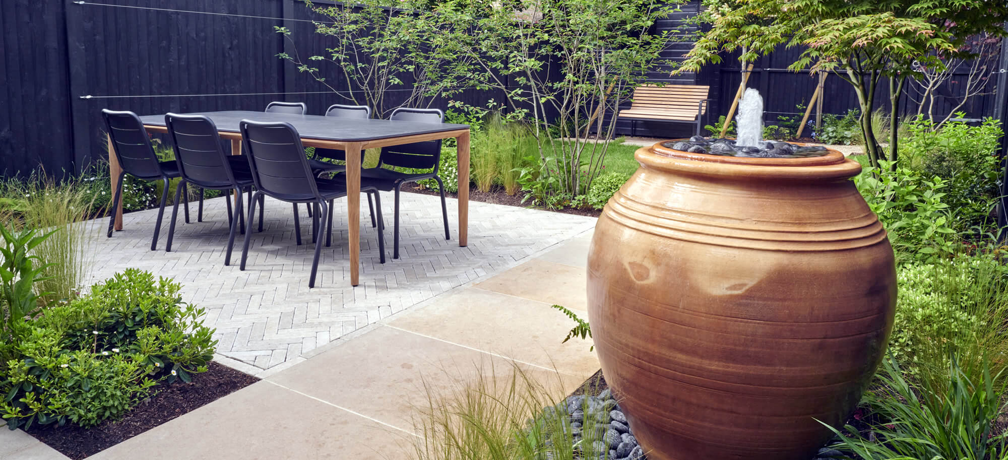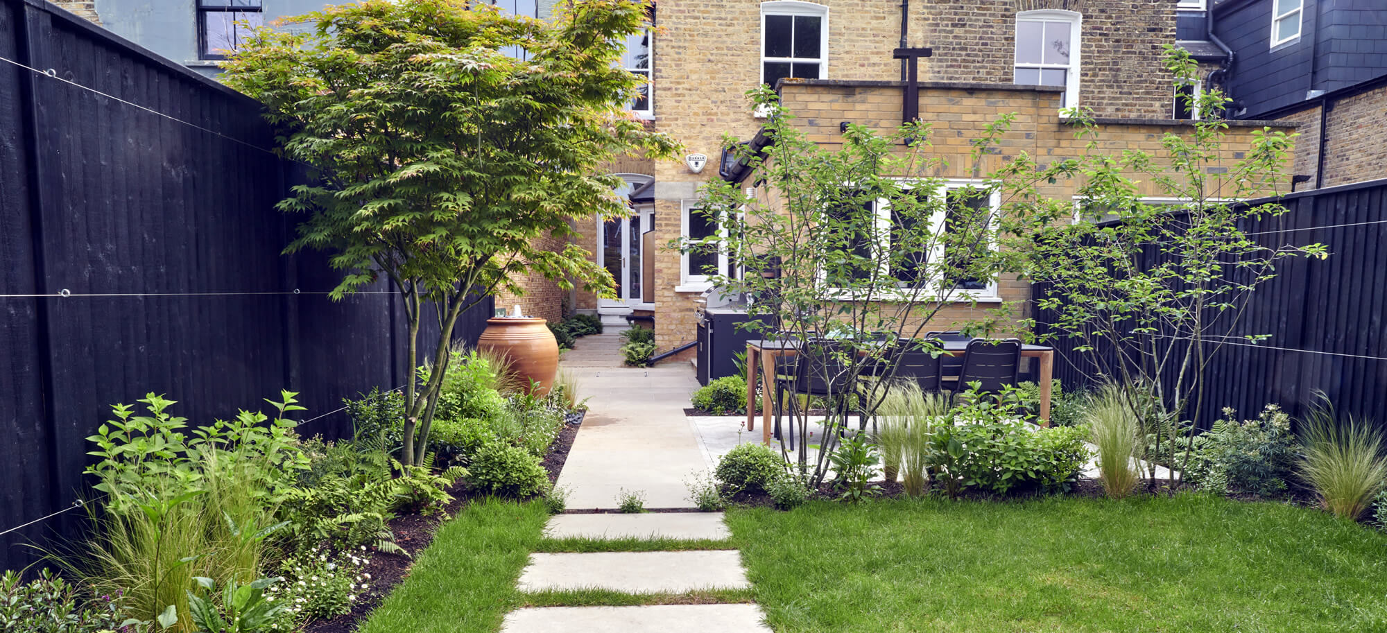 By designing the outdoor kitchen against the side return, this makes the most of this otherwise unused space and leaves the garden available to enjoy. The Grillo kitchen houses an integrated barbecue, fridge and storage. The natural stone stackers define the dining area as well as provide interest and variation to the patio. Painting the fences and shed in black helps define the space, adds a contemporary look and enhances the colour of surrounding planting. The stepping stones through the lawn provide access to the discreet shed and the back gate. The planting is a complementary mix of traditional herbaceous options such as erigeron, lavender and multistem amalanchier, with a subtle Japanese influence of the acer and added water feature.