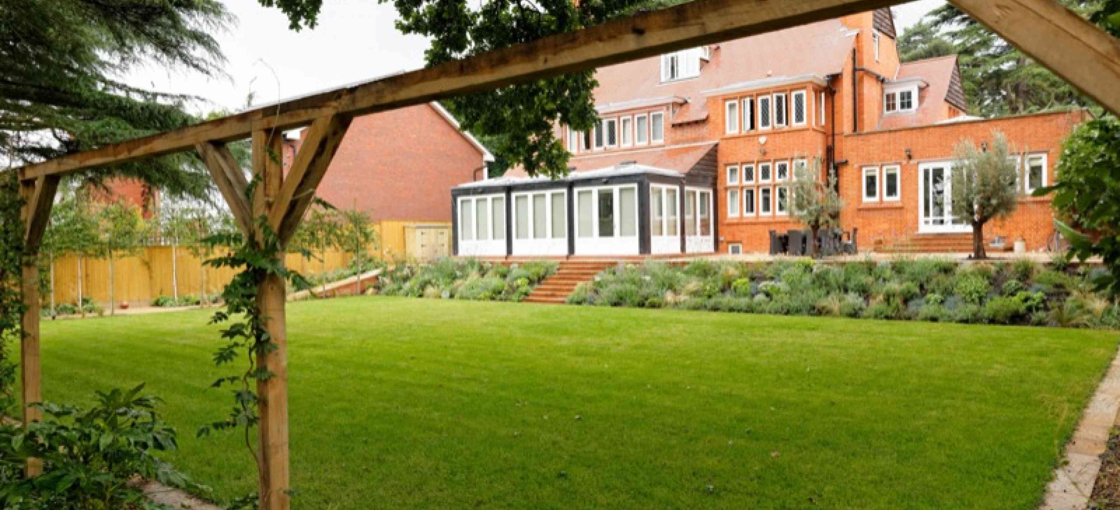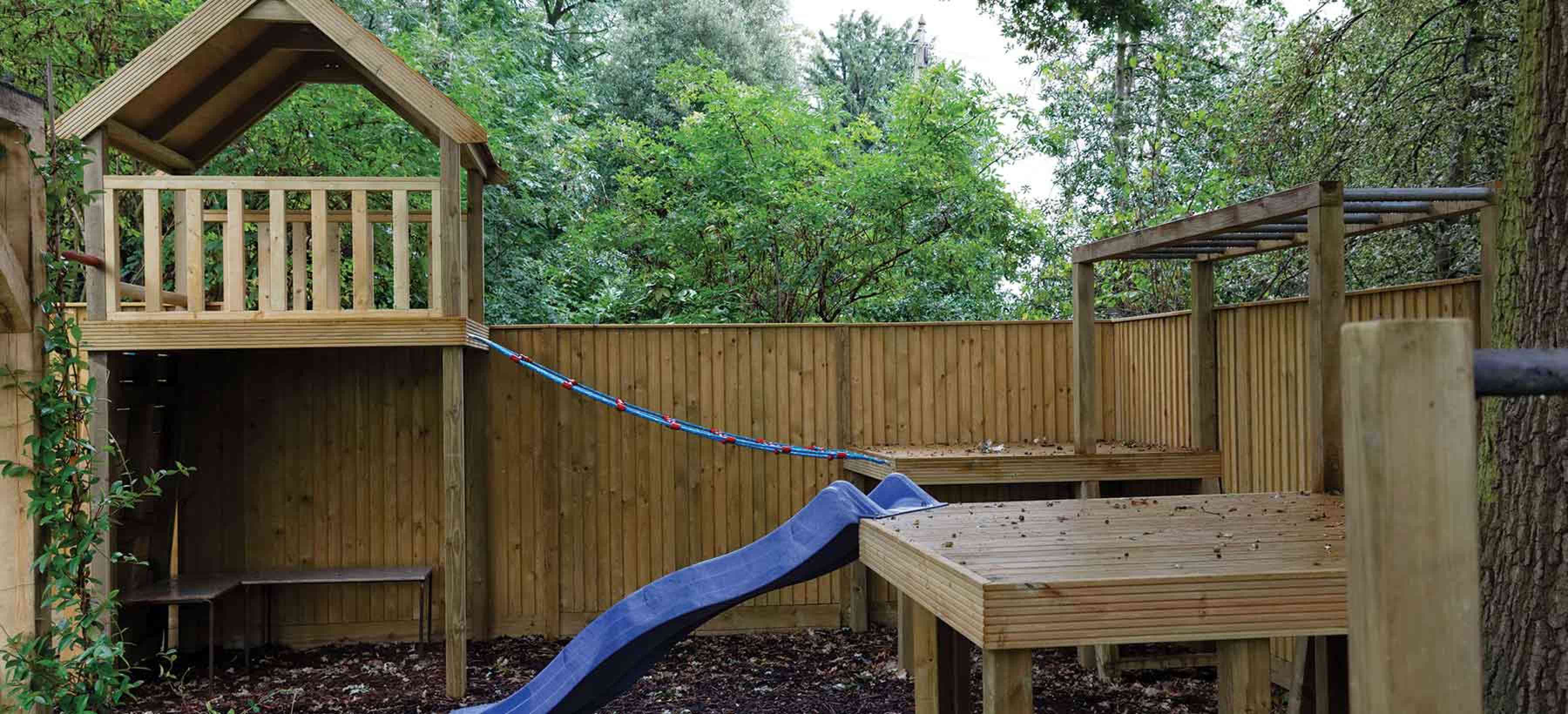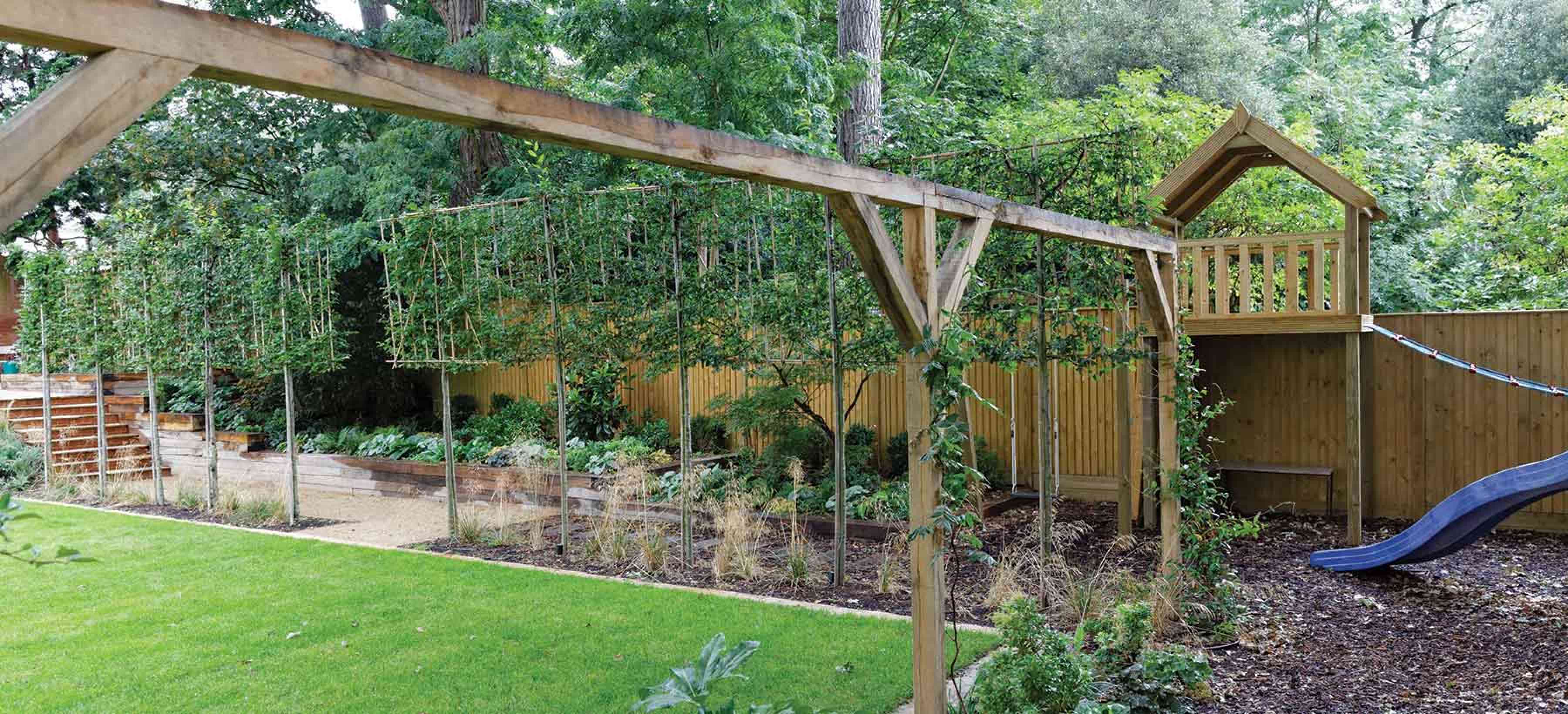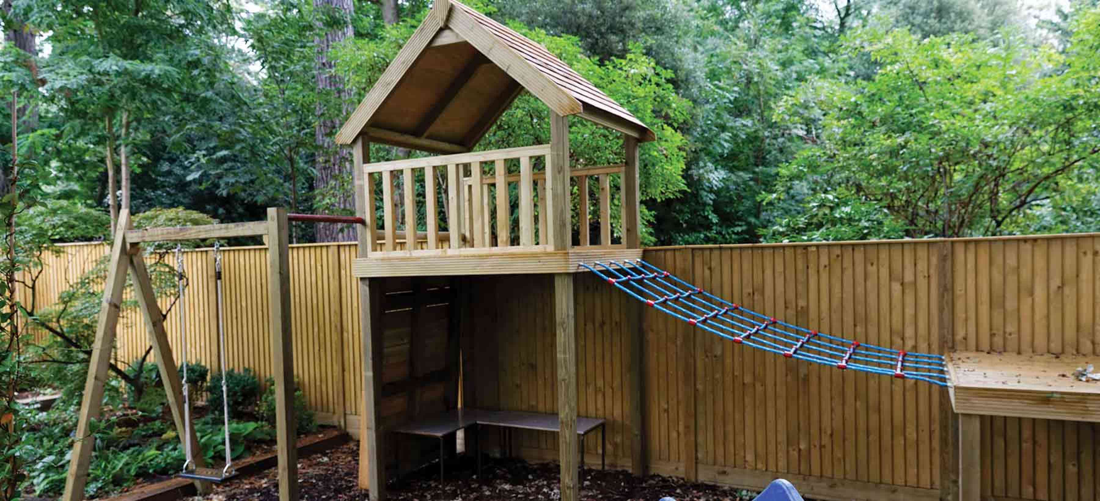 This large, family garden in Coombe, near Kingston-Upon-Thames, Surrey has a bespoke climbing frame, slide and swing, discreetly located in the rear corner of the garden.