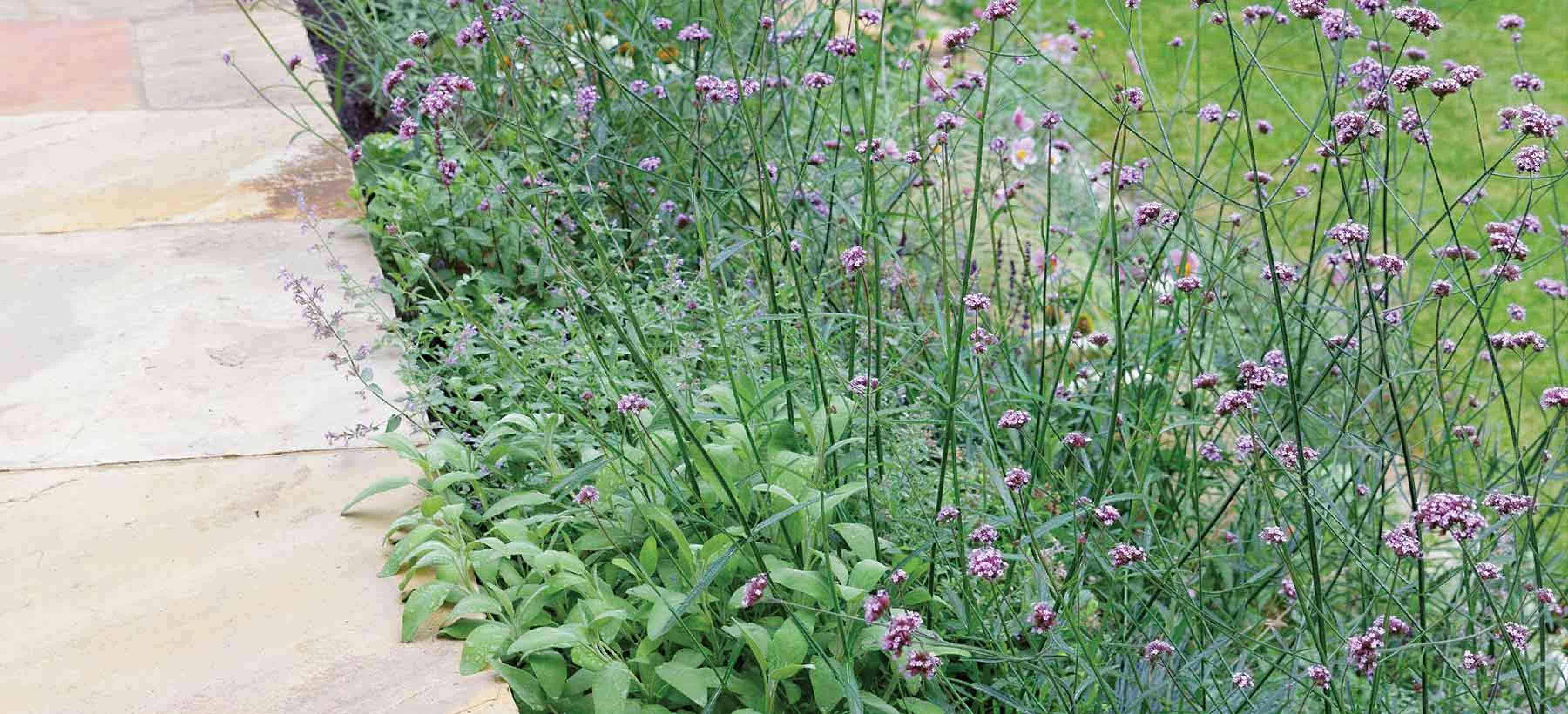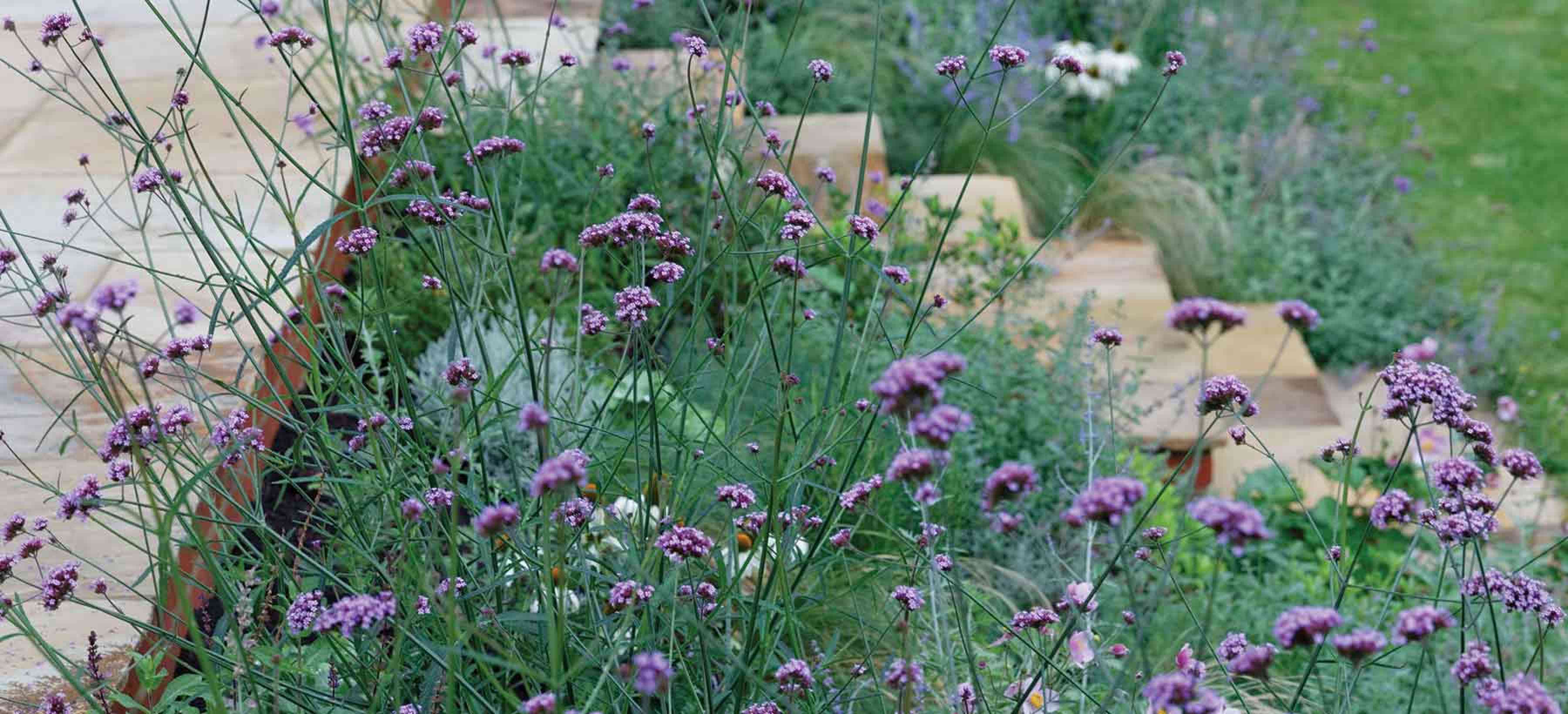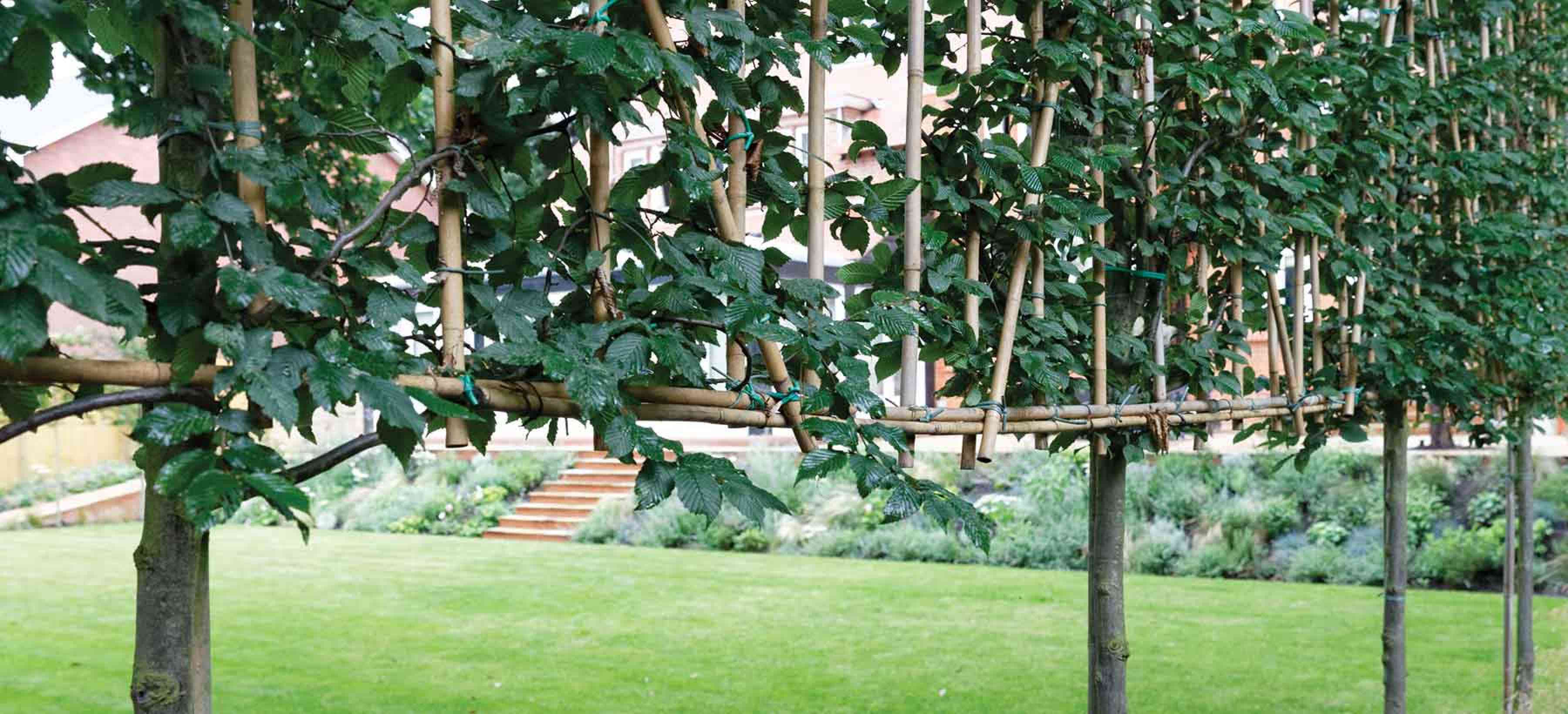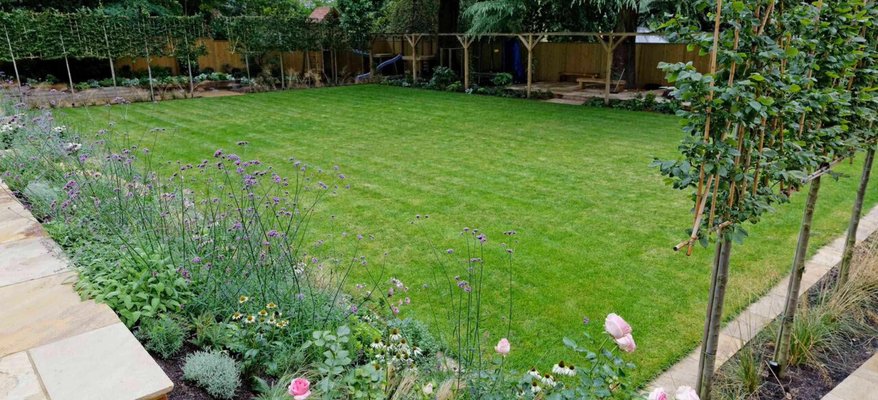 With a large family, the client wanted to retain as much lawn as possible, so the bold planting in green, white, purple and pink is kept to the boarders. The pleached trees on either side of the garden add structure and formality as well as effective screening.