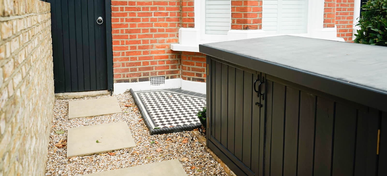 Traditional and elegant front garden. Victorian tessilated path compliments the stone and gravel on either side.