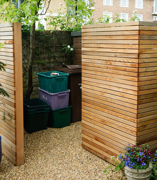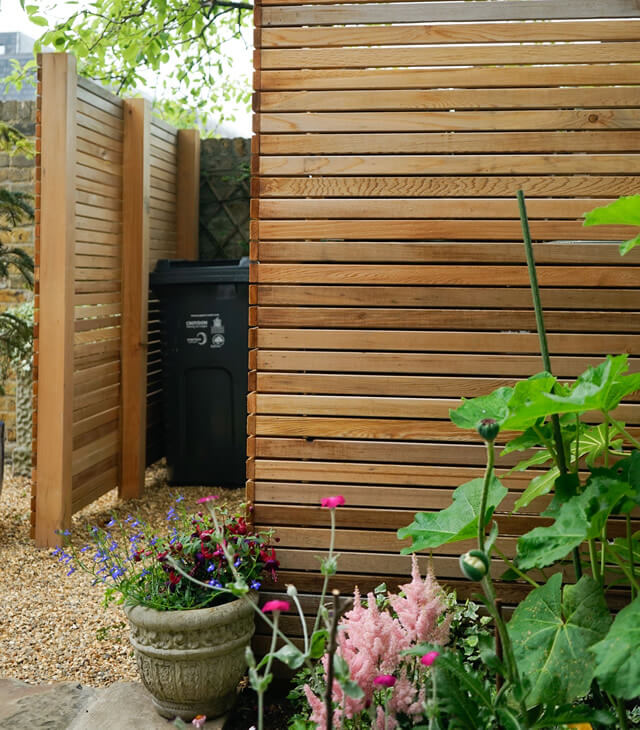 Main gate and pedestrian entrance with perimeter stone to provide a threshold between the drive and the pavement. Subtle, cedar baton screening gives a neat, yet easily accessible bin storage area.