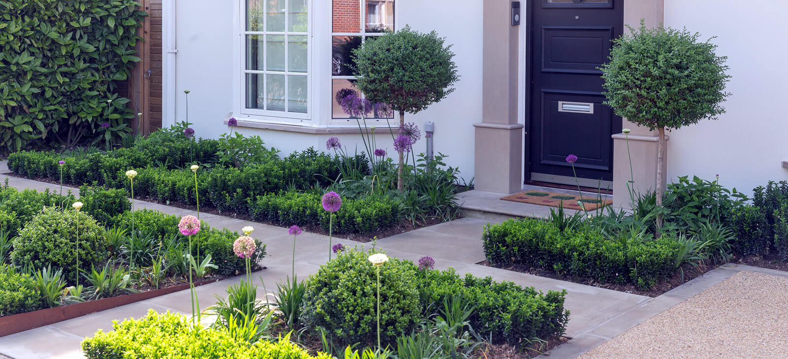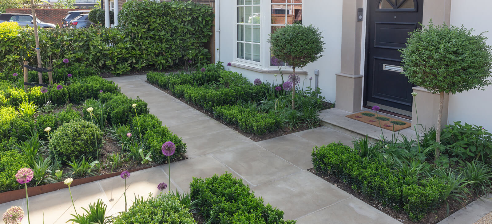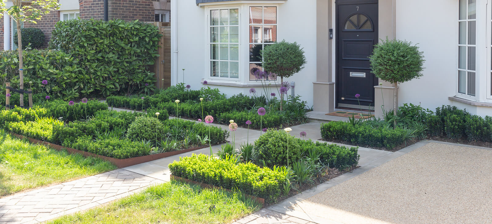 Modern front garden with clean lines, to match the architecture of the house, Sofened by willowy purple sensation alliums.