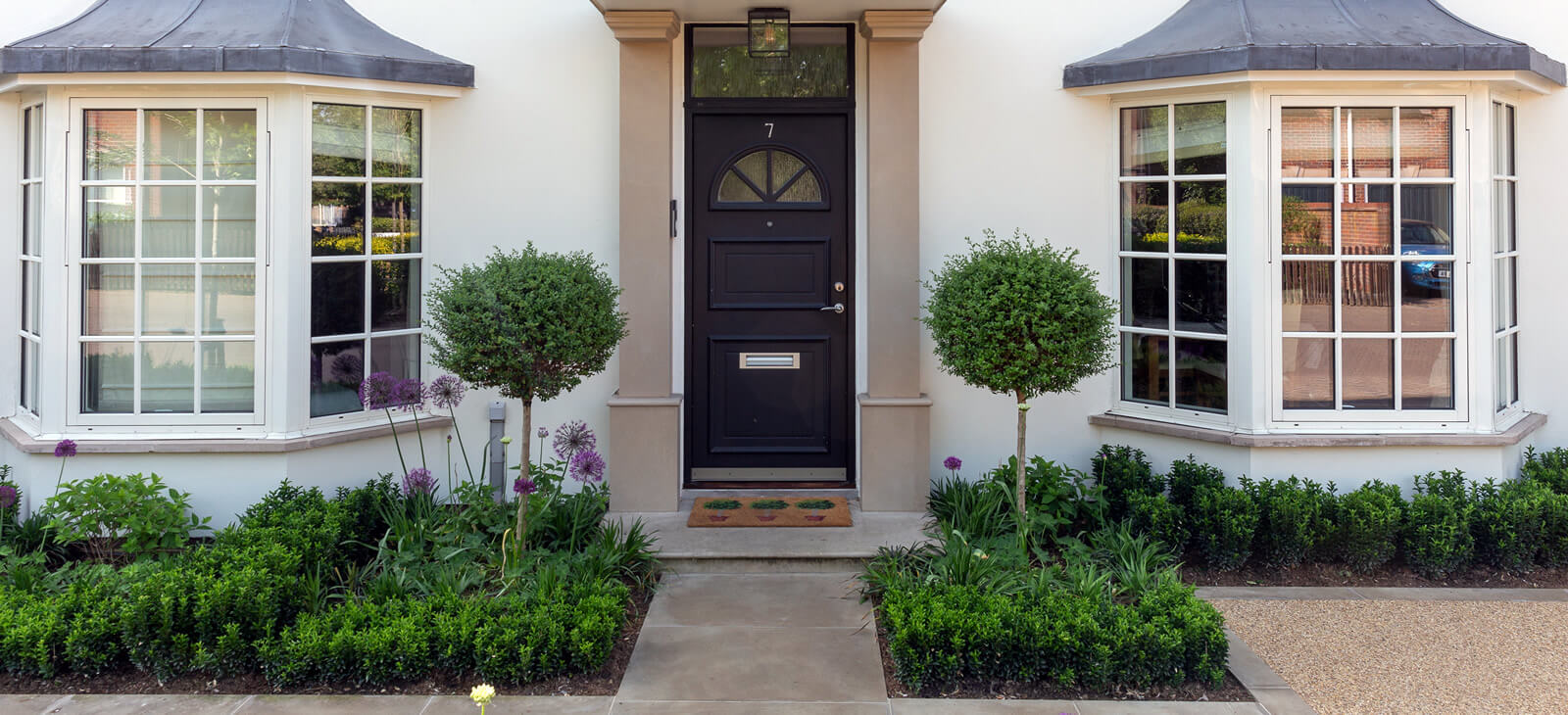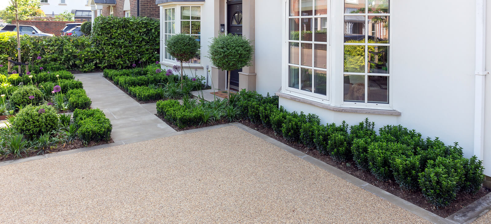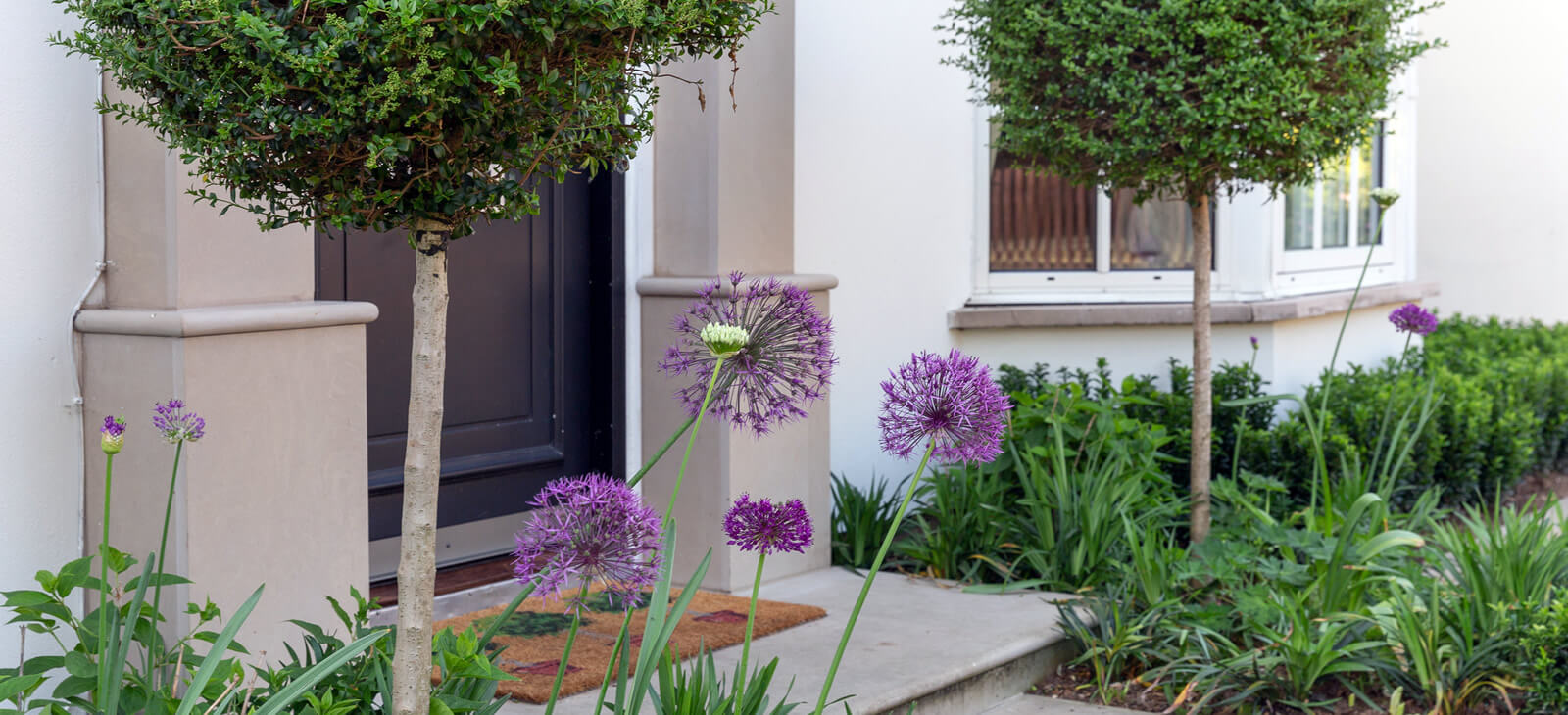 Modern front garden with clean lines, to match the architecture of the house, Sofened by willowy purple sensation alliums.