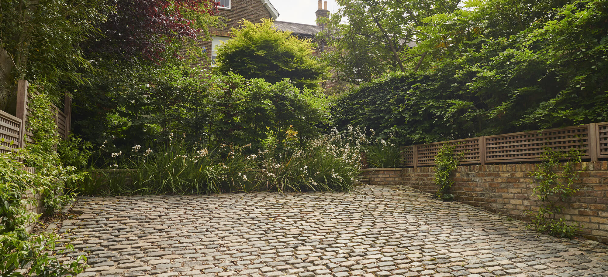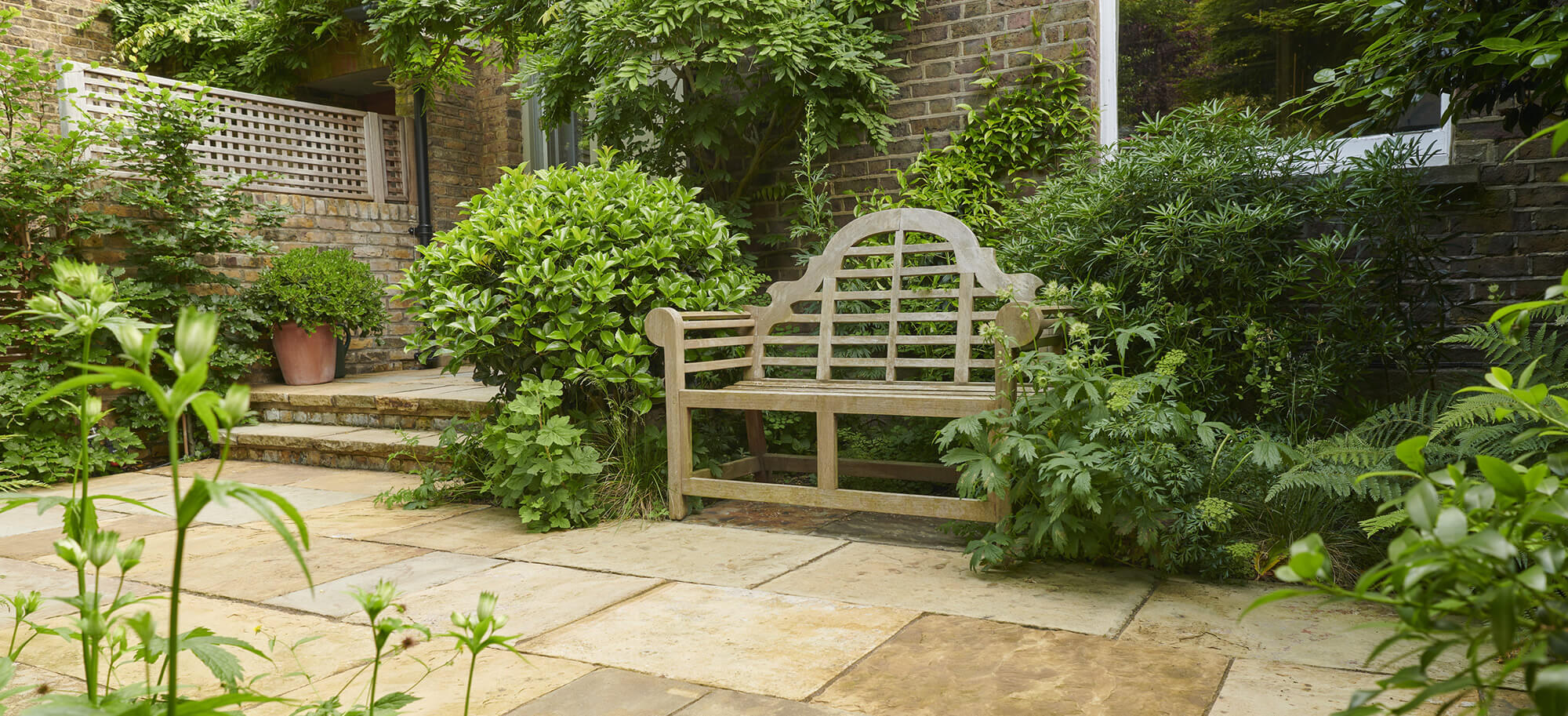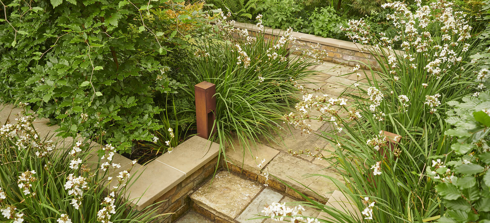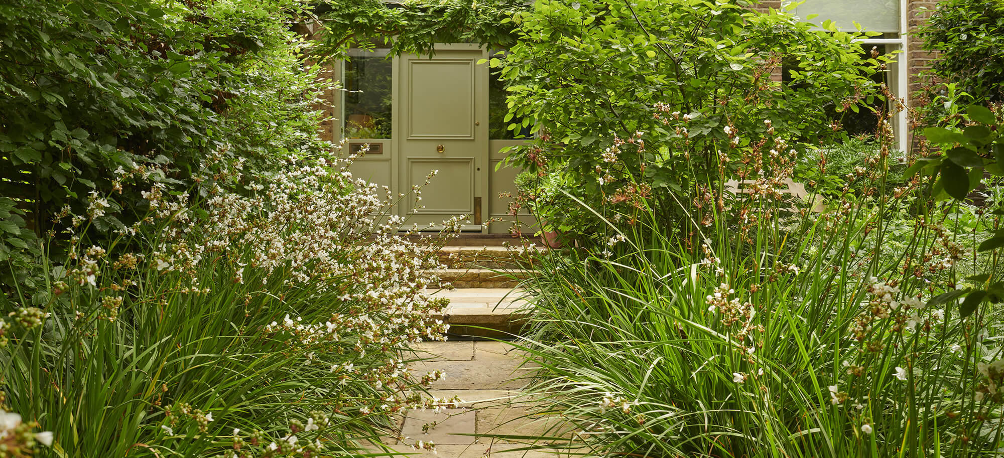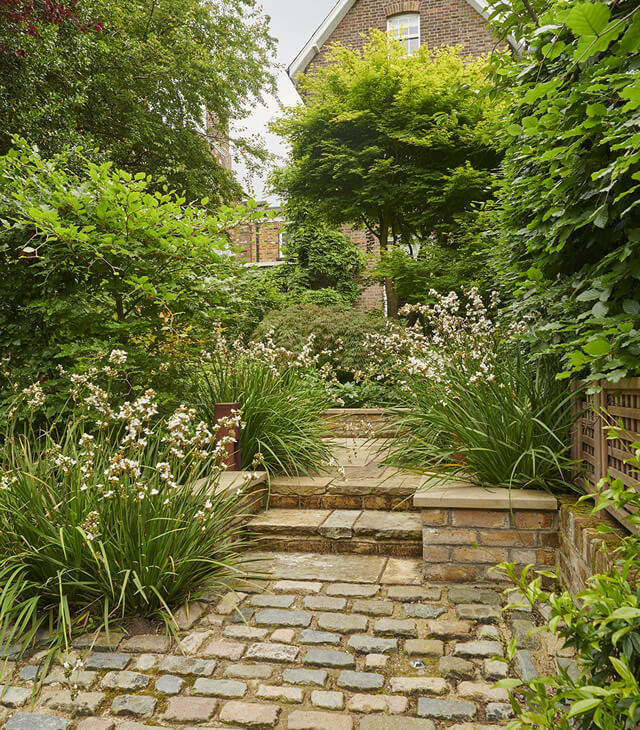 ...leading into a winding York stone path with discreet lighting. The low raised brick planters include lush, shade-loving, over-spilling plants providing year-round interest. A front garden that is both functional but not dominated by a driveway for vehicles.