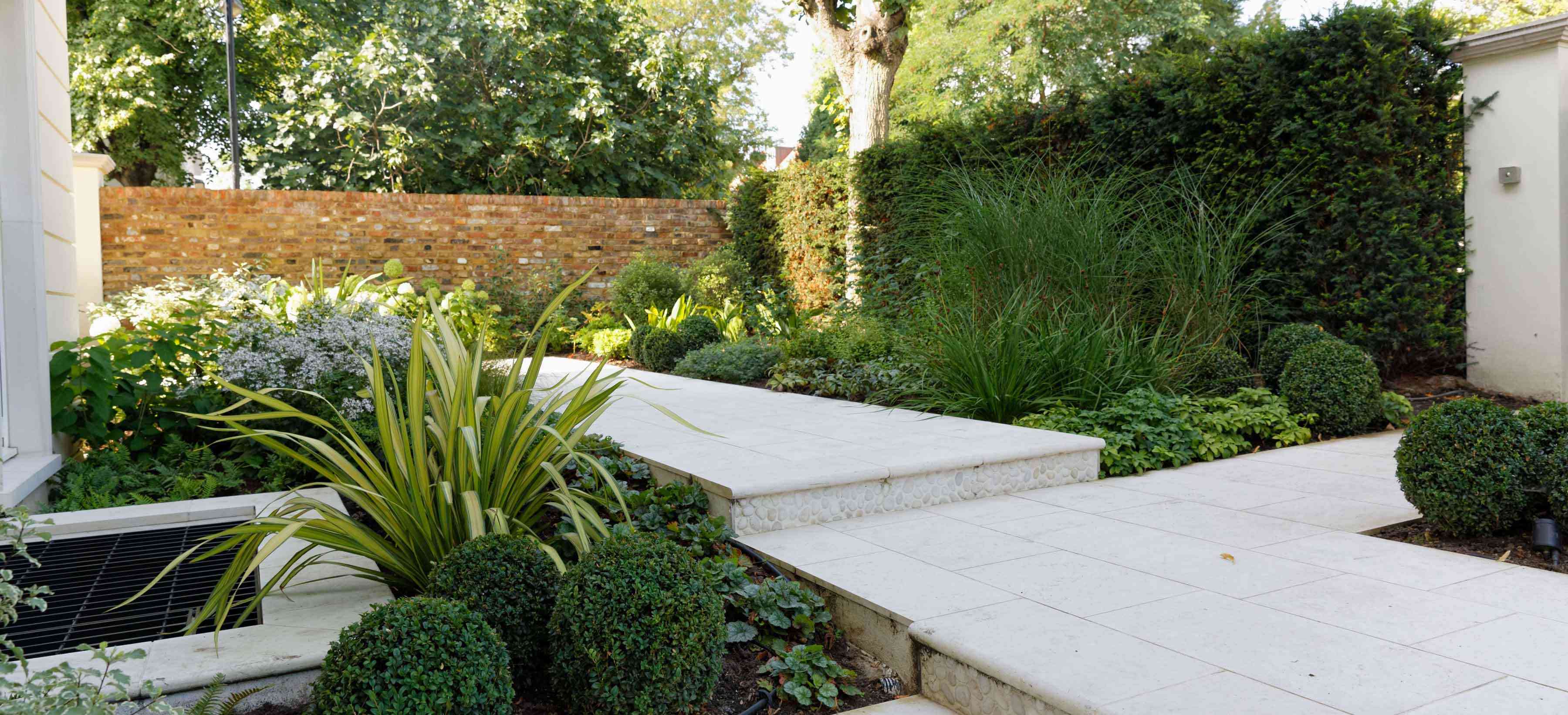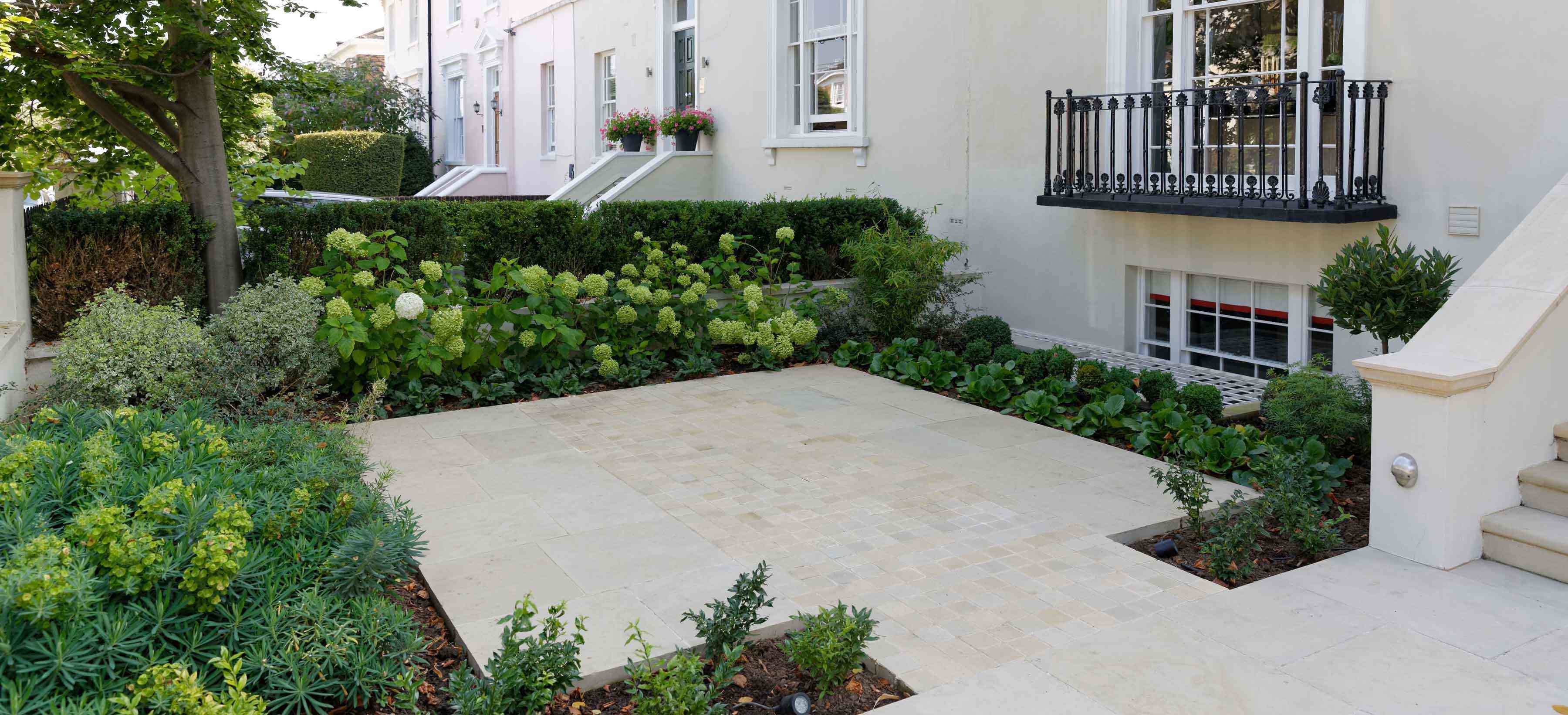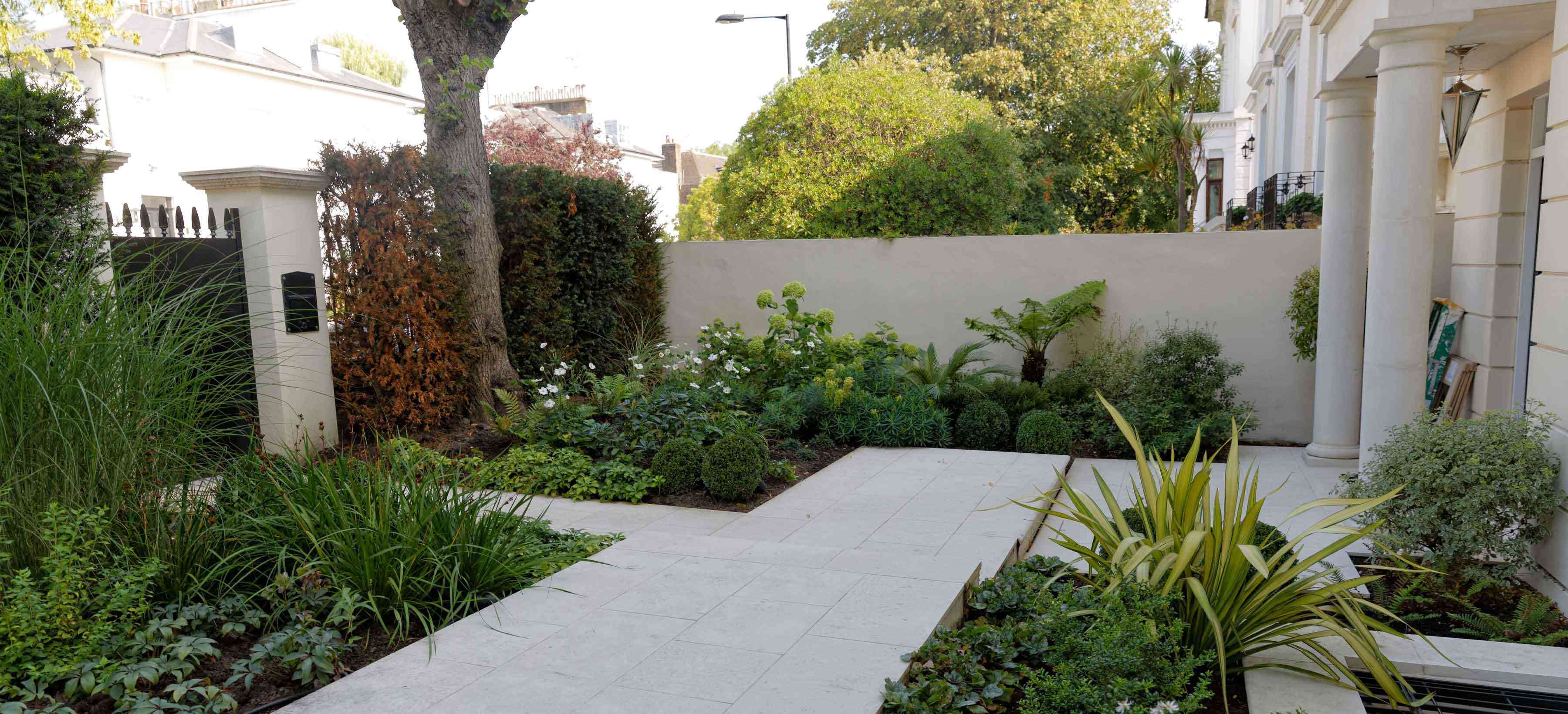 This front garden complements the design of the rear garden with its bold green planting.