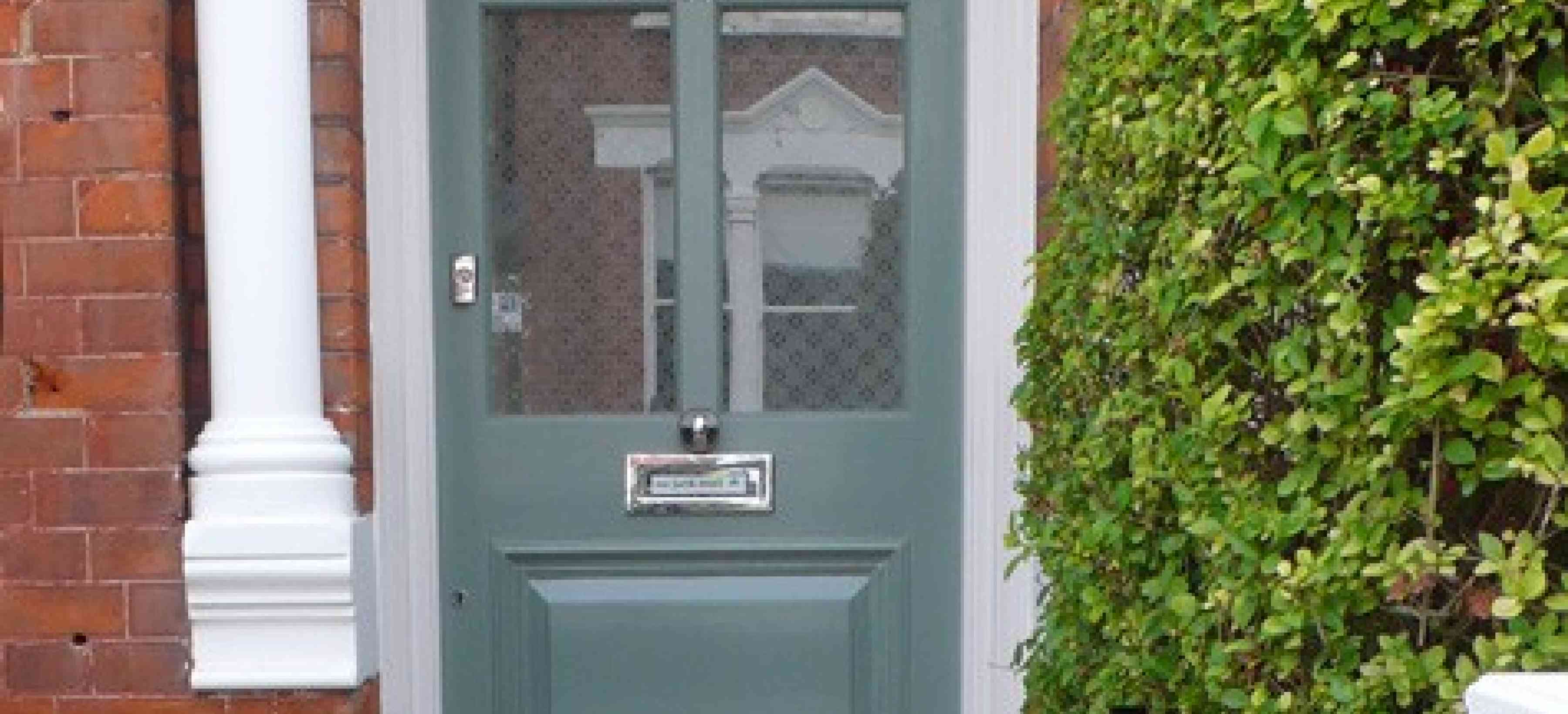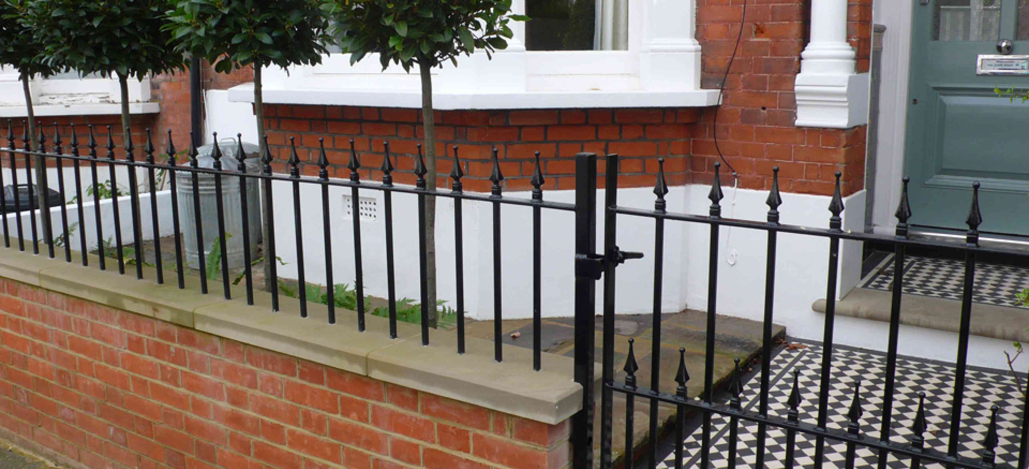 A traditional, front garden in South West London with a new boundary wall, bespoke railings, reclaimed Yorkstone and a Victorian mosaic path.
