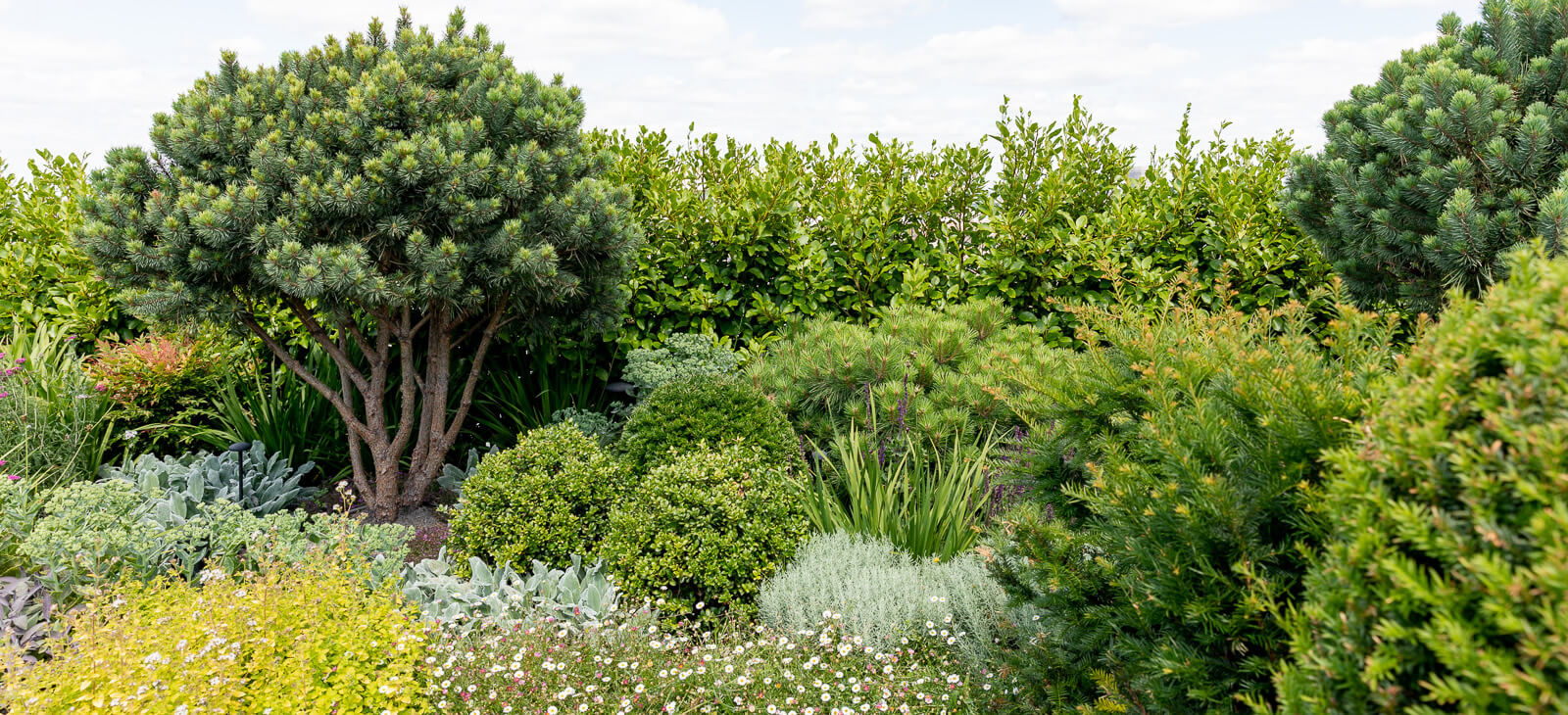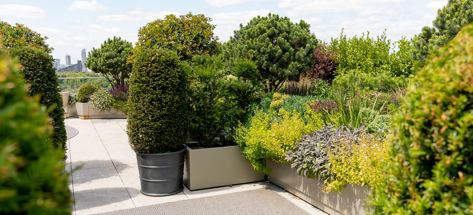 A large dual aspect roof garden, with existing built-in planters. The planting provides immediate impact but also the ability to withstand the extreme elements in such an exposed location. The planting design included established taxus topiary, pinus sylvestris wateryii, pittosporum, osmanthus, herbs and stachys for year-round interest.