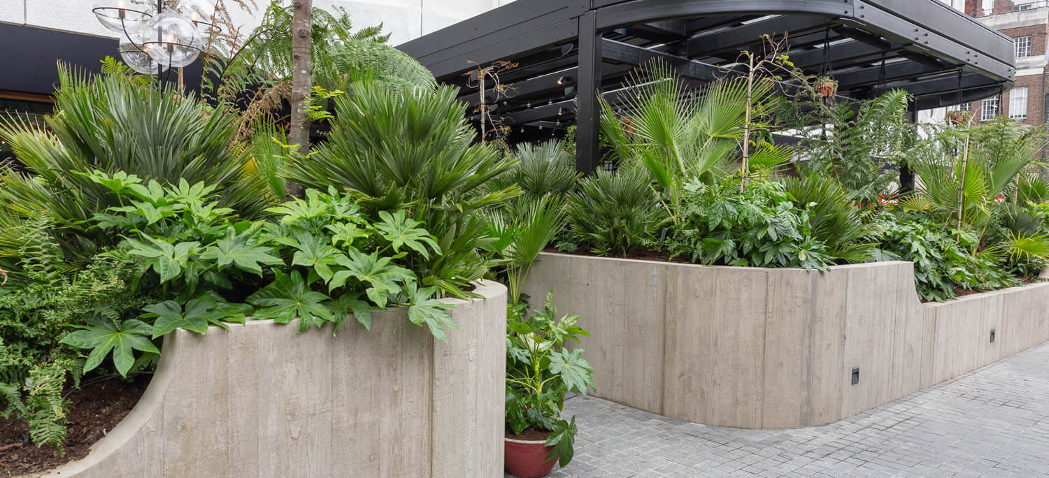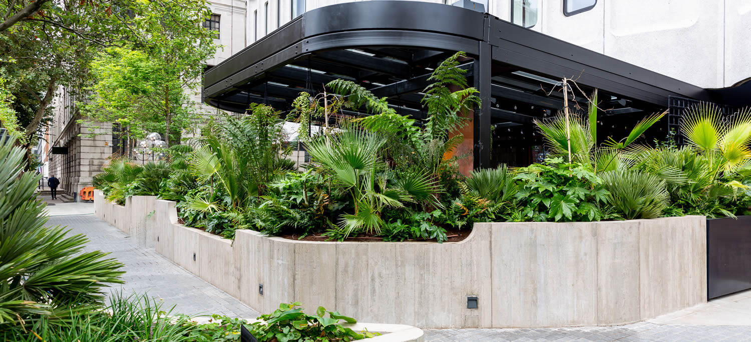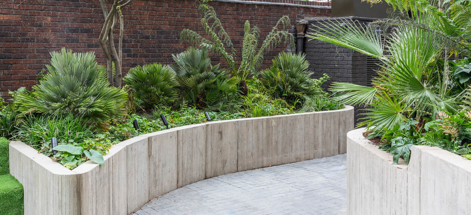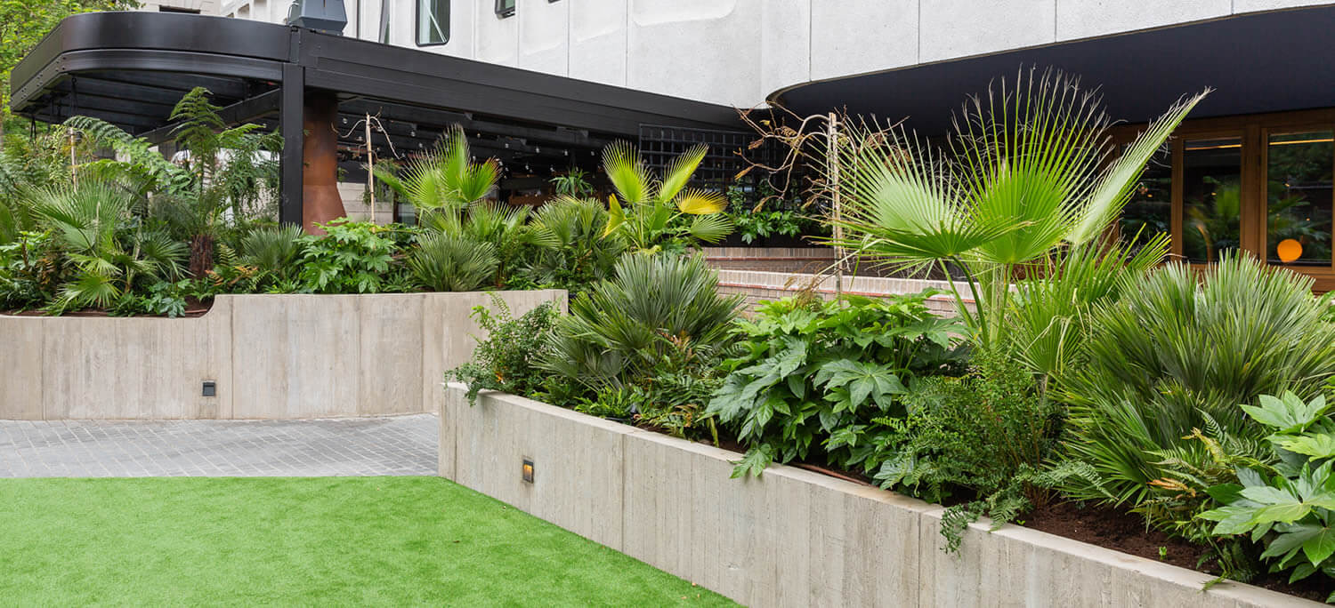 The landscaping mirrors the Brutalist architecture, with large mock-wooden, concrete planters, featured around the hotel entrance.