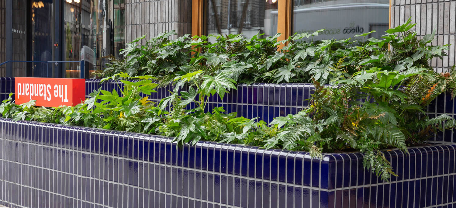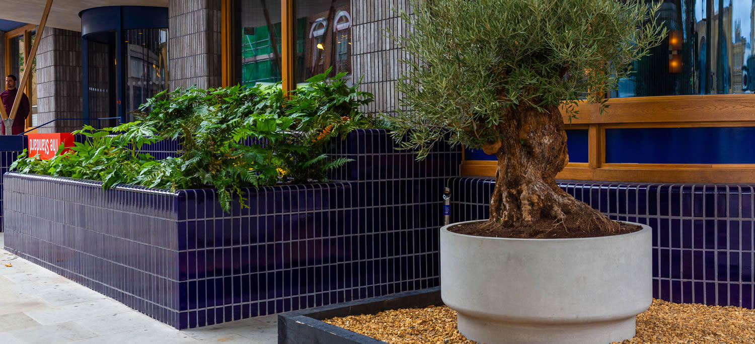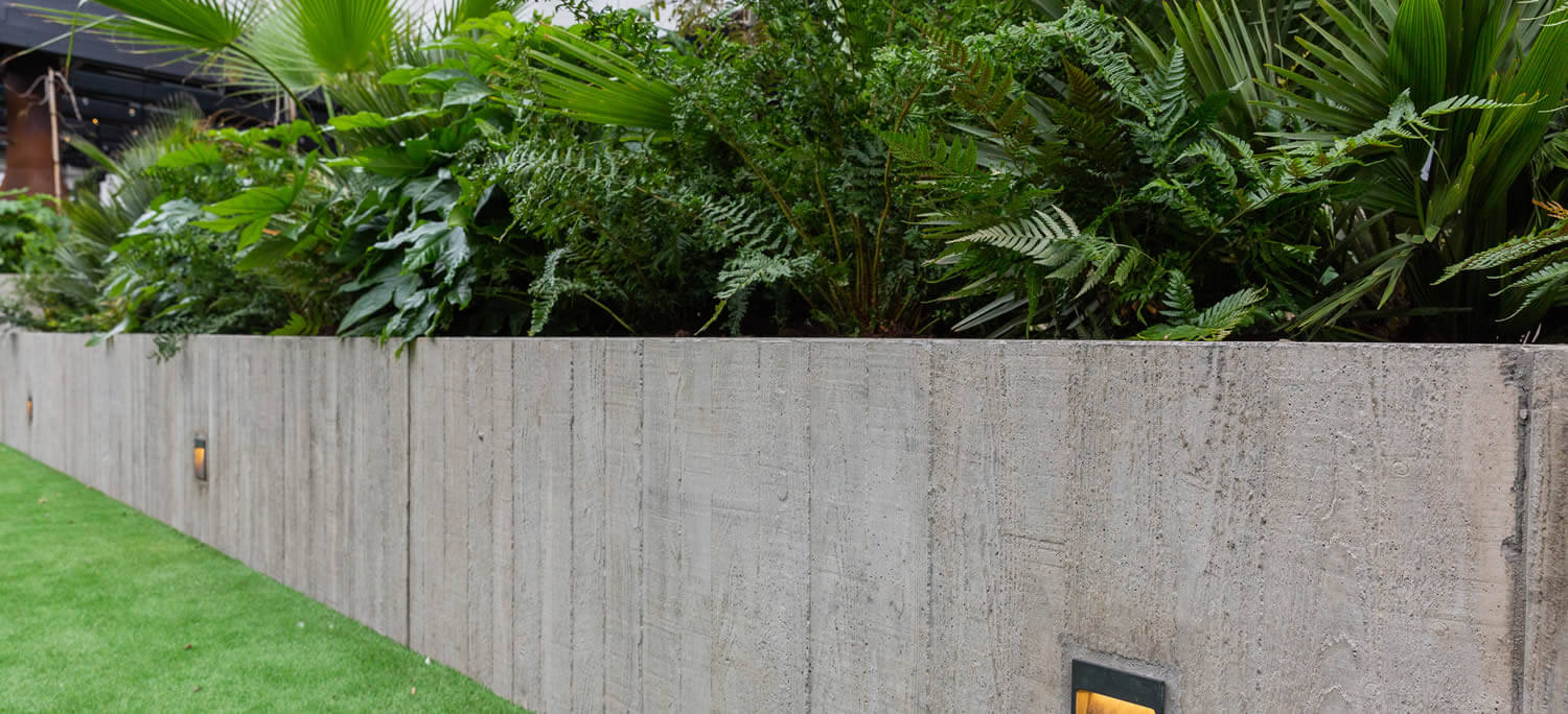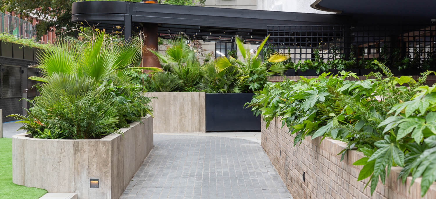 The landscaping mirrors the Brutalist architecture, with large mock-wooden, concrete planters, featured around the hotel entrance.