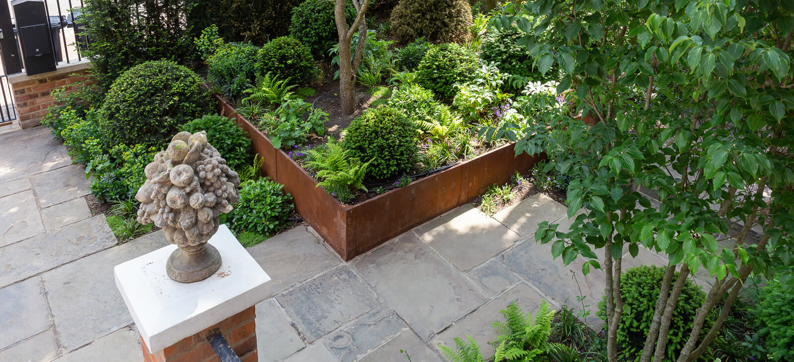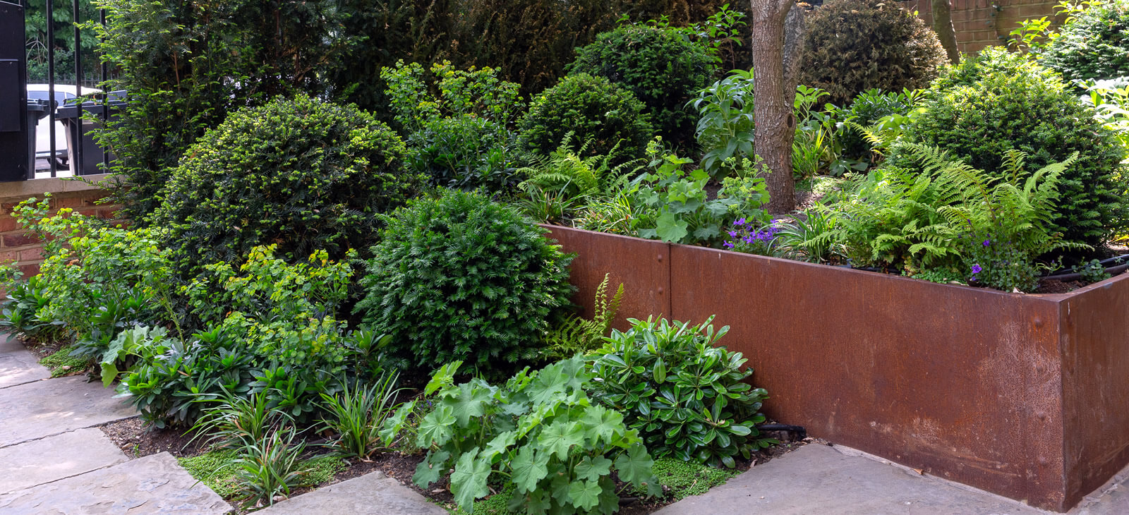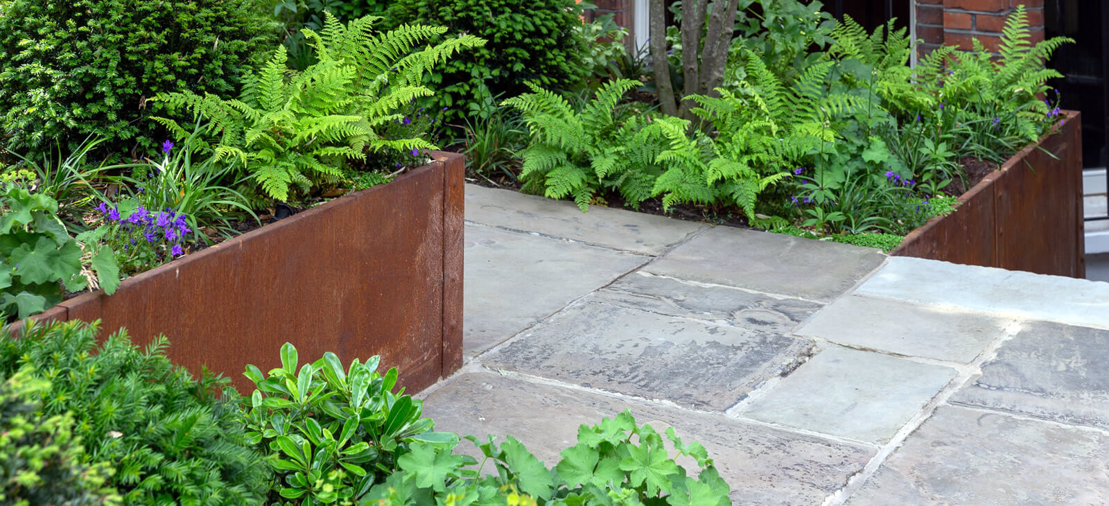 ...with the corner rivet detailing was used in this front garden to give an aged appearance, rather anything too new or contemporary. The Catalpa tree was incorporated into the design as a client favourite with the large leaves.