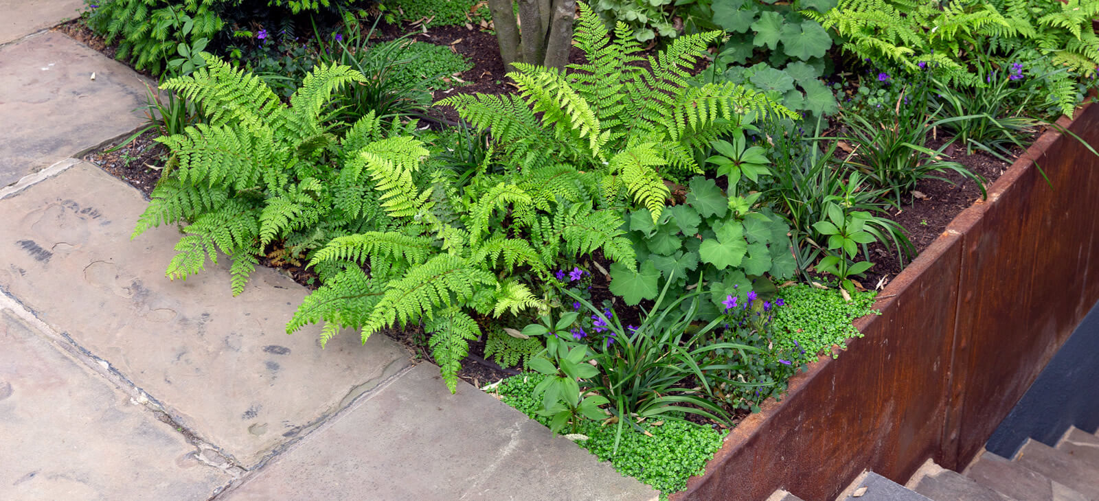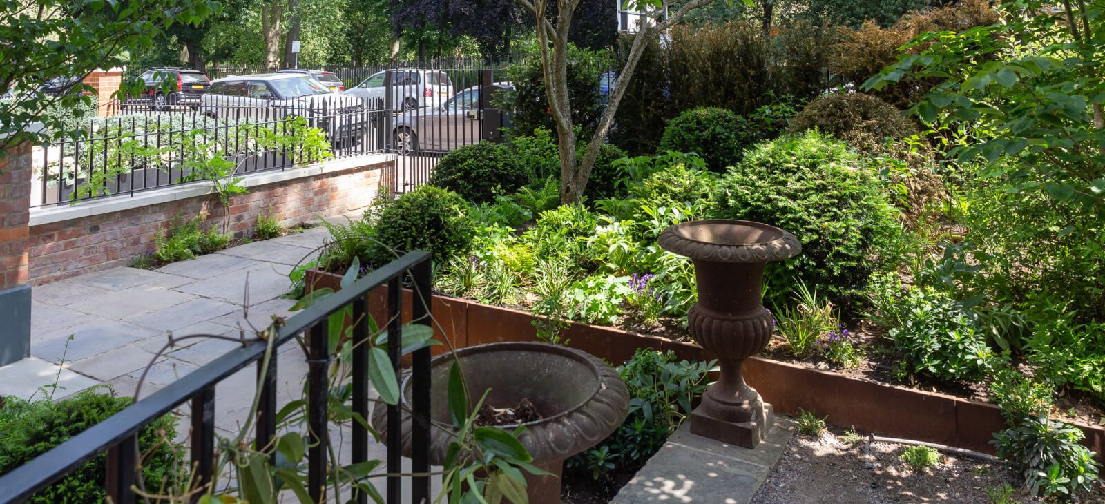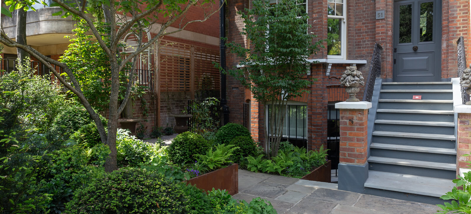 ...with the corner rivet detailing was used in this front garden to give an aged appearance, rather anything too new or contemporary. The Catalpa tree was incorporated into the design as a client favourite with the large leaves.