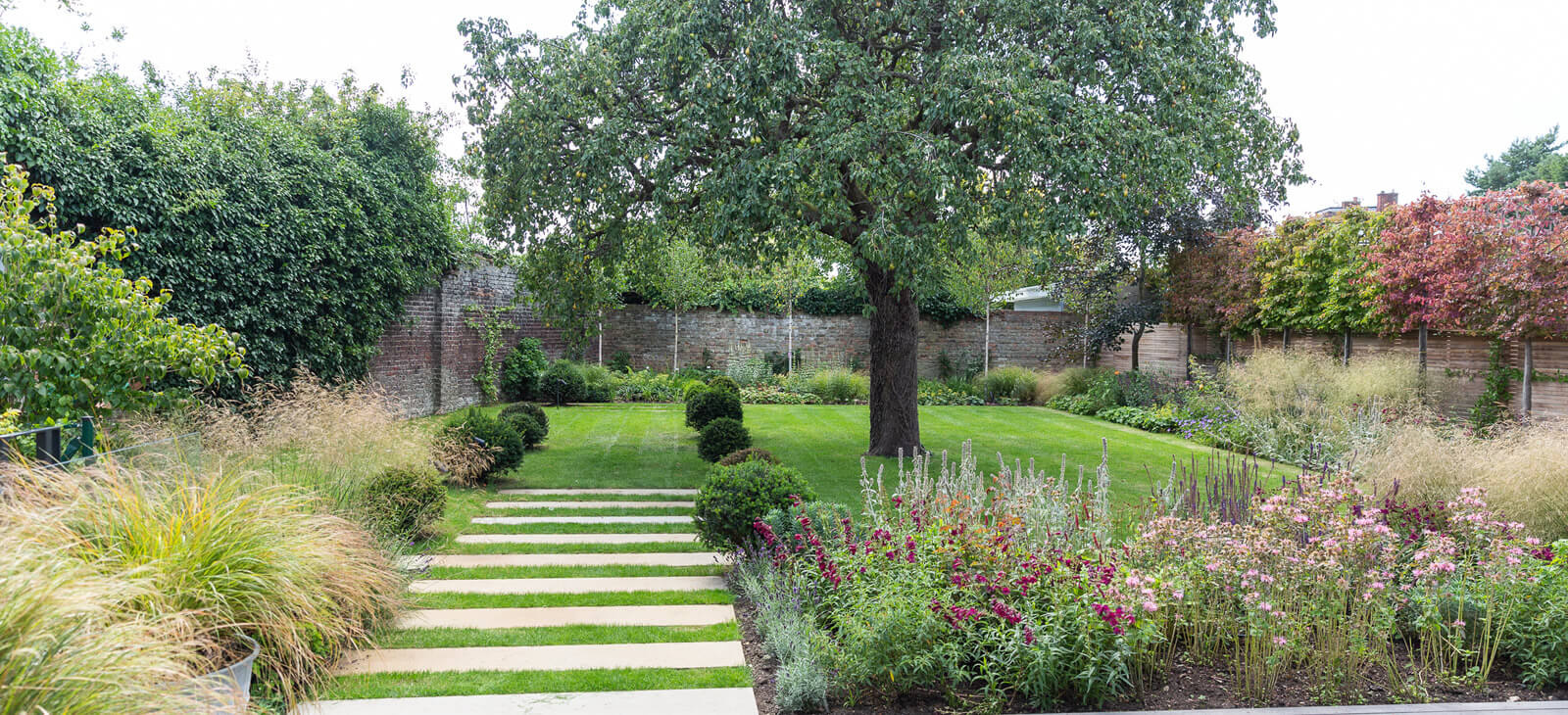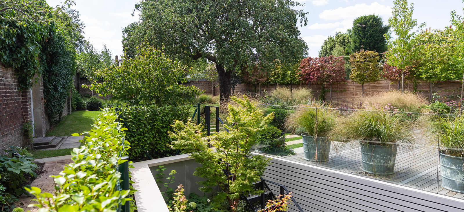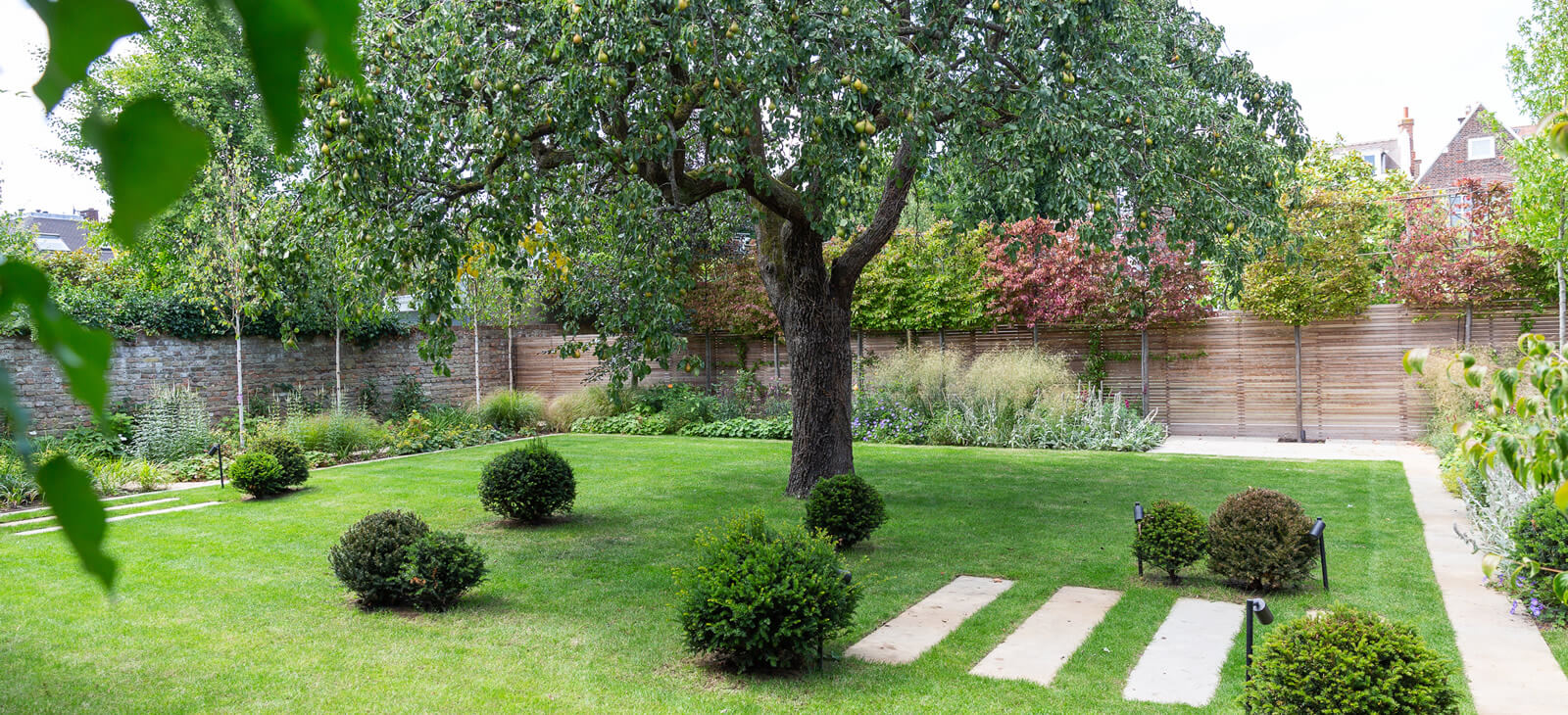 The client's design brief priorities included natural screening on one side of the garden and to create a view point, upon entering the house through the front door through to the rear garden. The design also incorporated the feature pear tree in the centre of the garden.