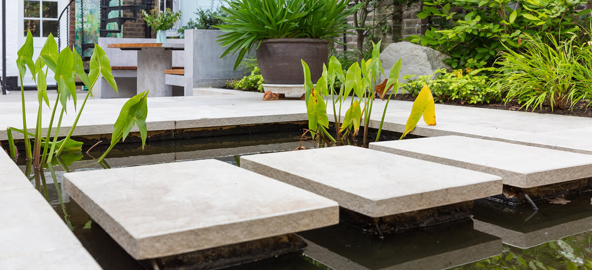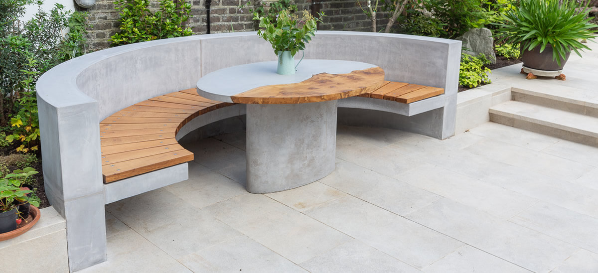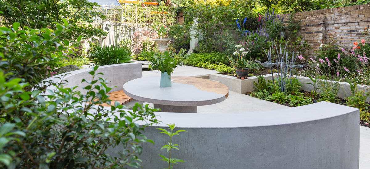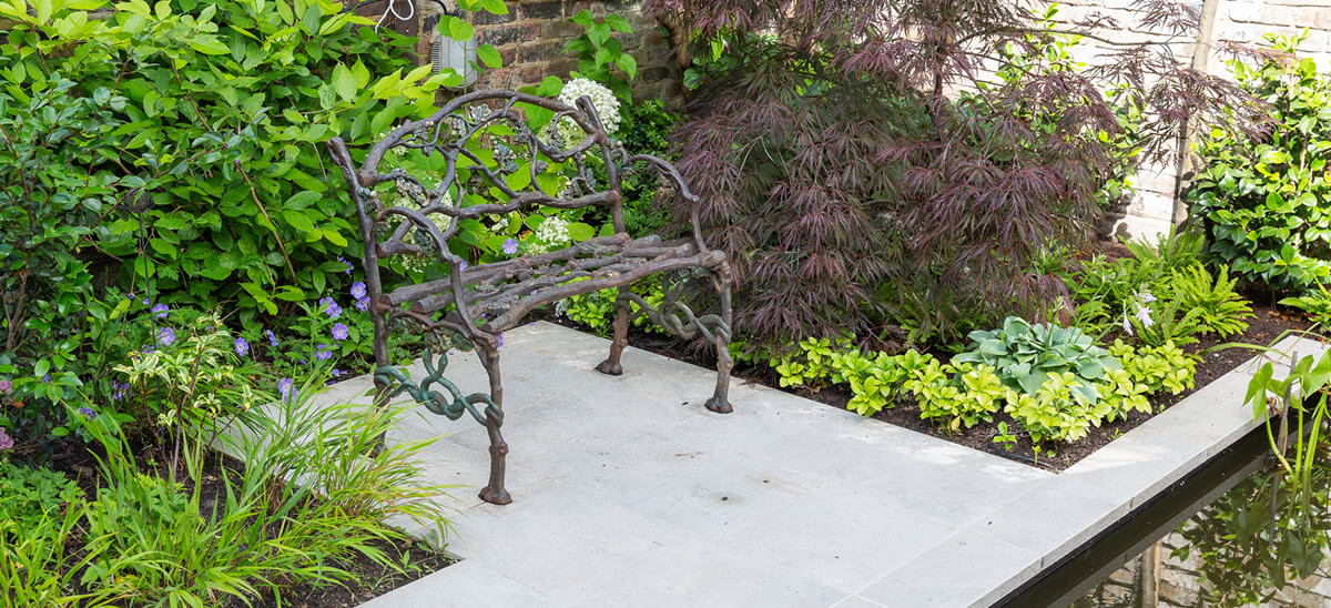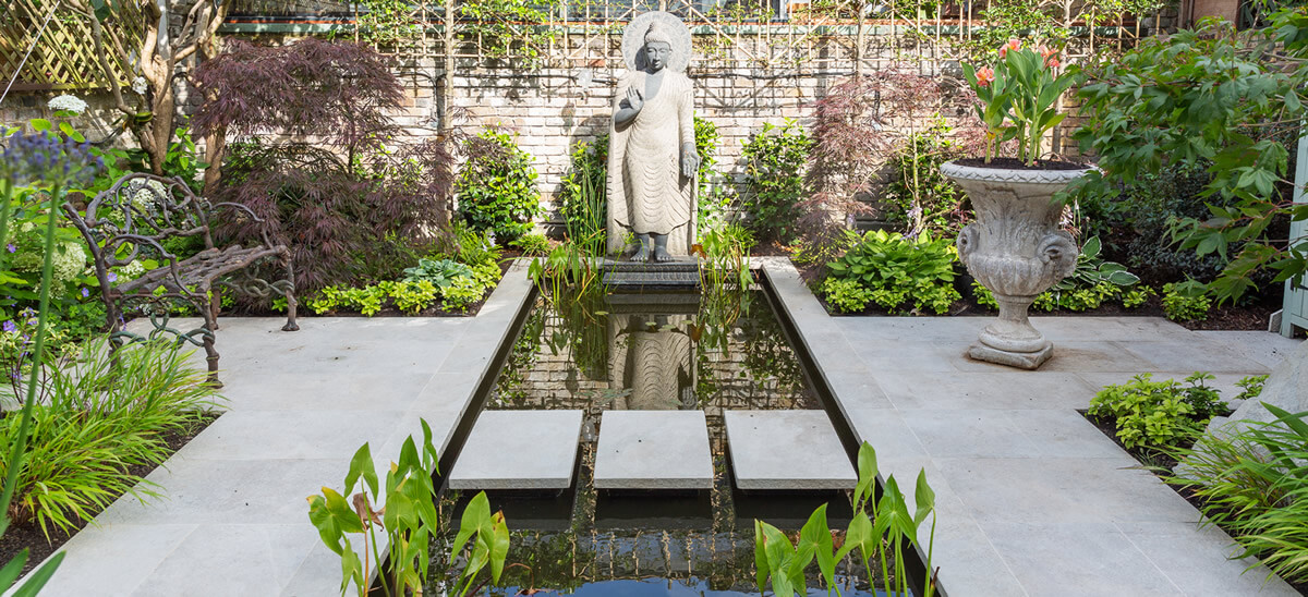The geometric design leads the eye to the Buddha and acers were selected for their sympathetic relationship with the Buddha as well as for their stunning autumnal colour. White camelias line the back wall under pleached trees for privacy. The bench and table are bespoke concrete features and the cream porcelain paving looks similar to limestone. The lighting adds extra atmosphere in the evening and the boulders are fake.