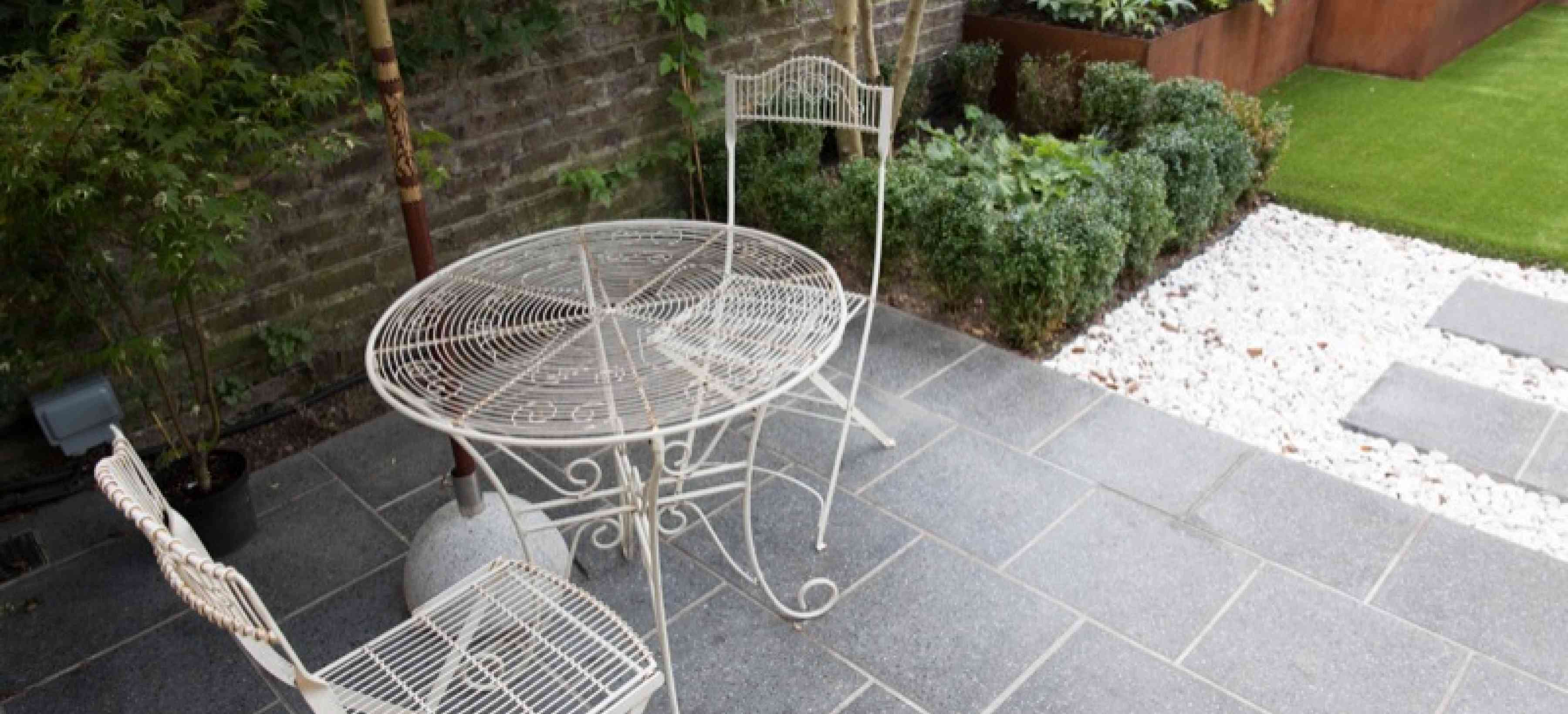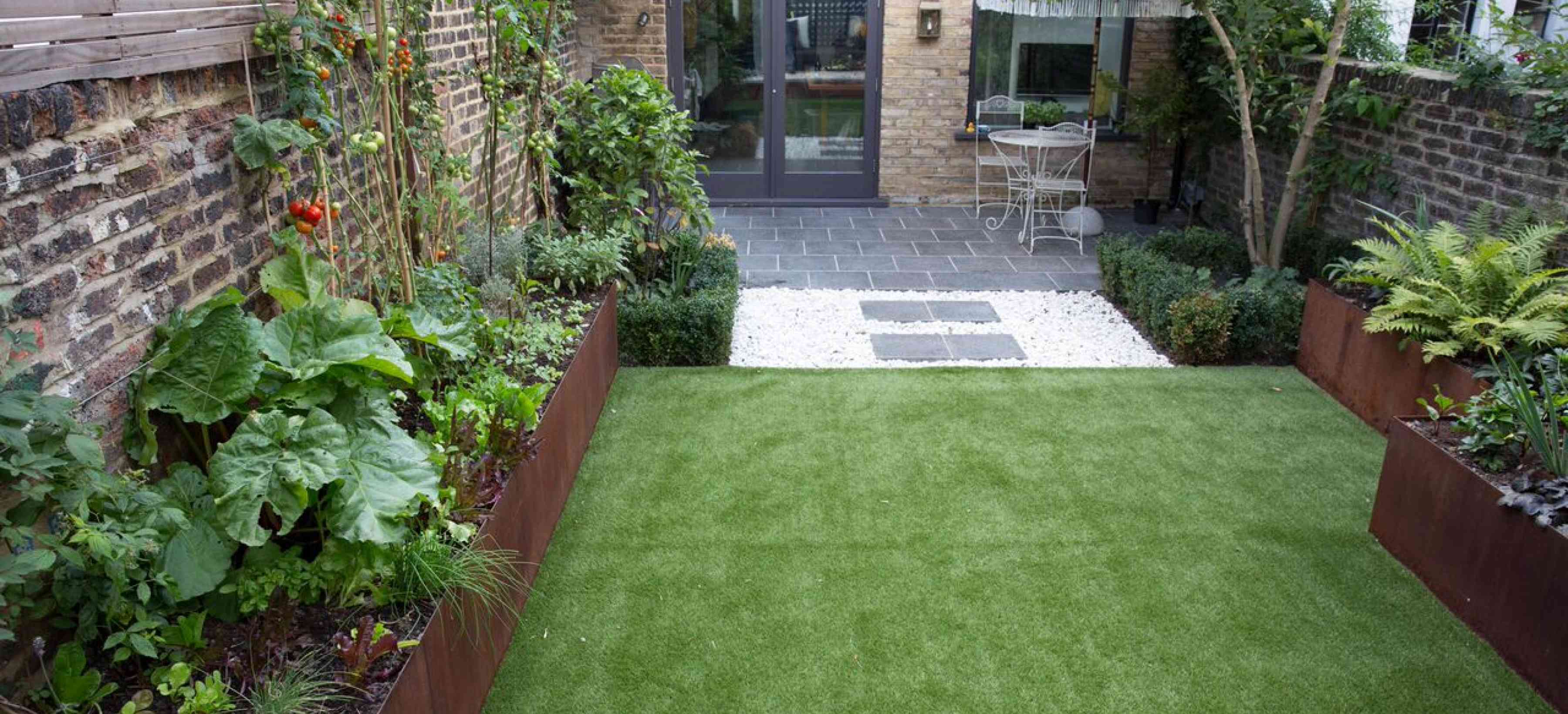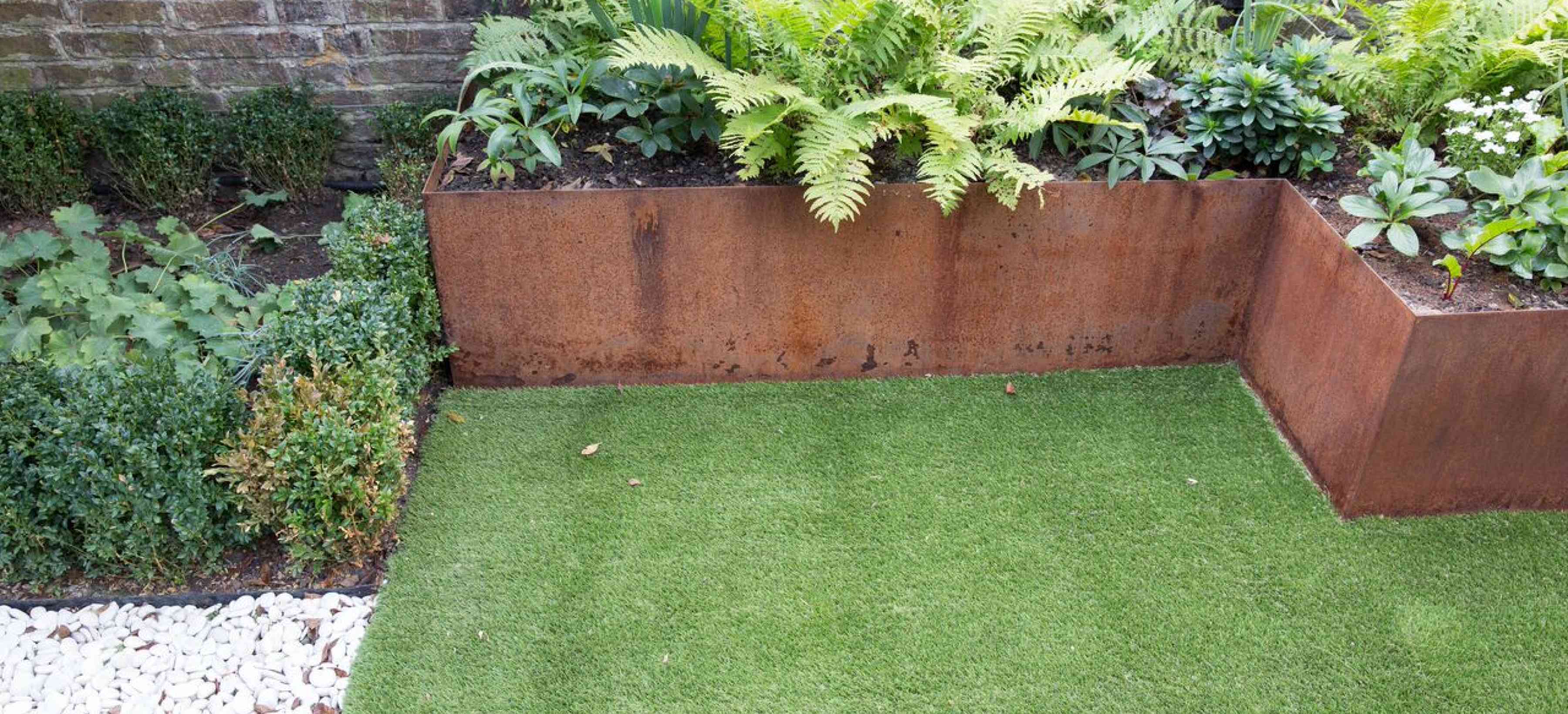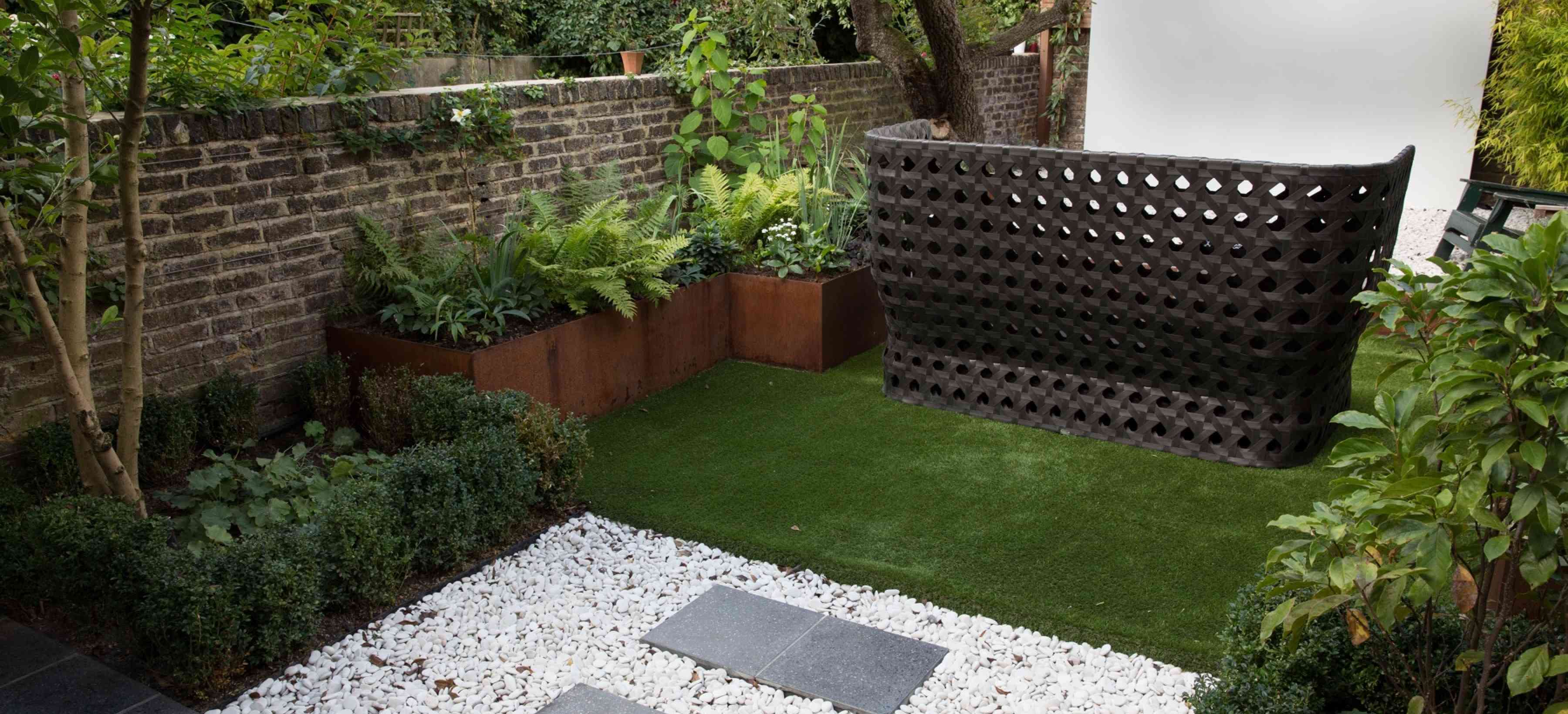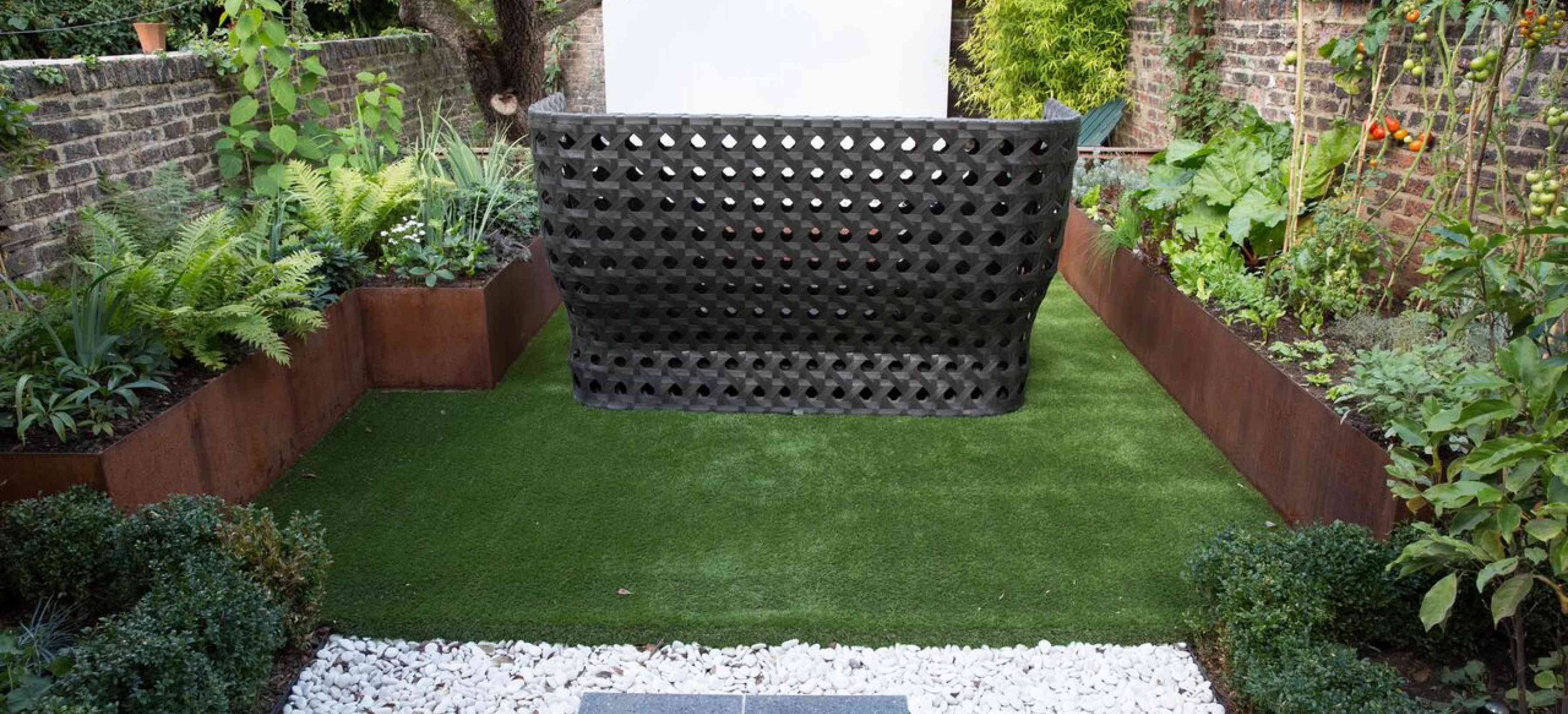 Using the white rendered wall and a statement outdoor sofa, this garden is transformed into an open-air cinema. Other features include raised Corten steel planters, a polished concrete terrace and artificial grass.