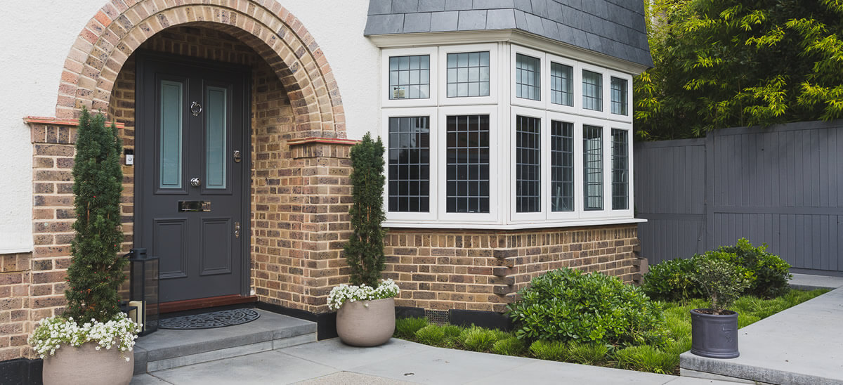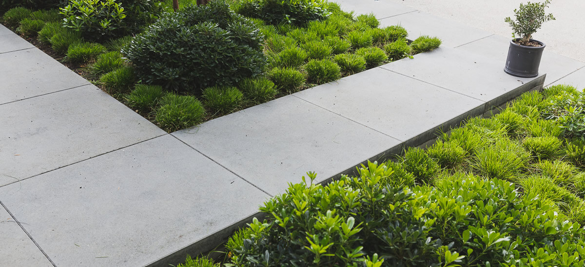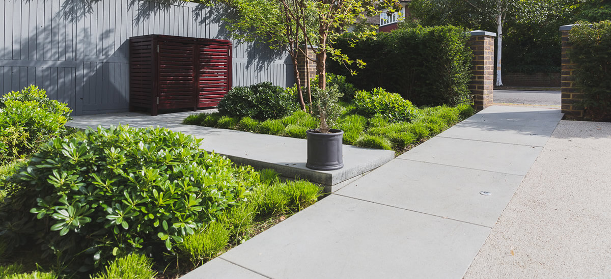 Clean lines and architectural design transformed the front garden to provide a strong first impression to the house following a complete renovation. Large scale pre formed concrete slab paving created a series of steps from the pavement to the front door.