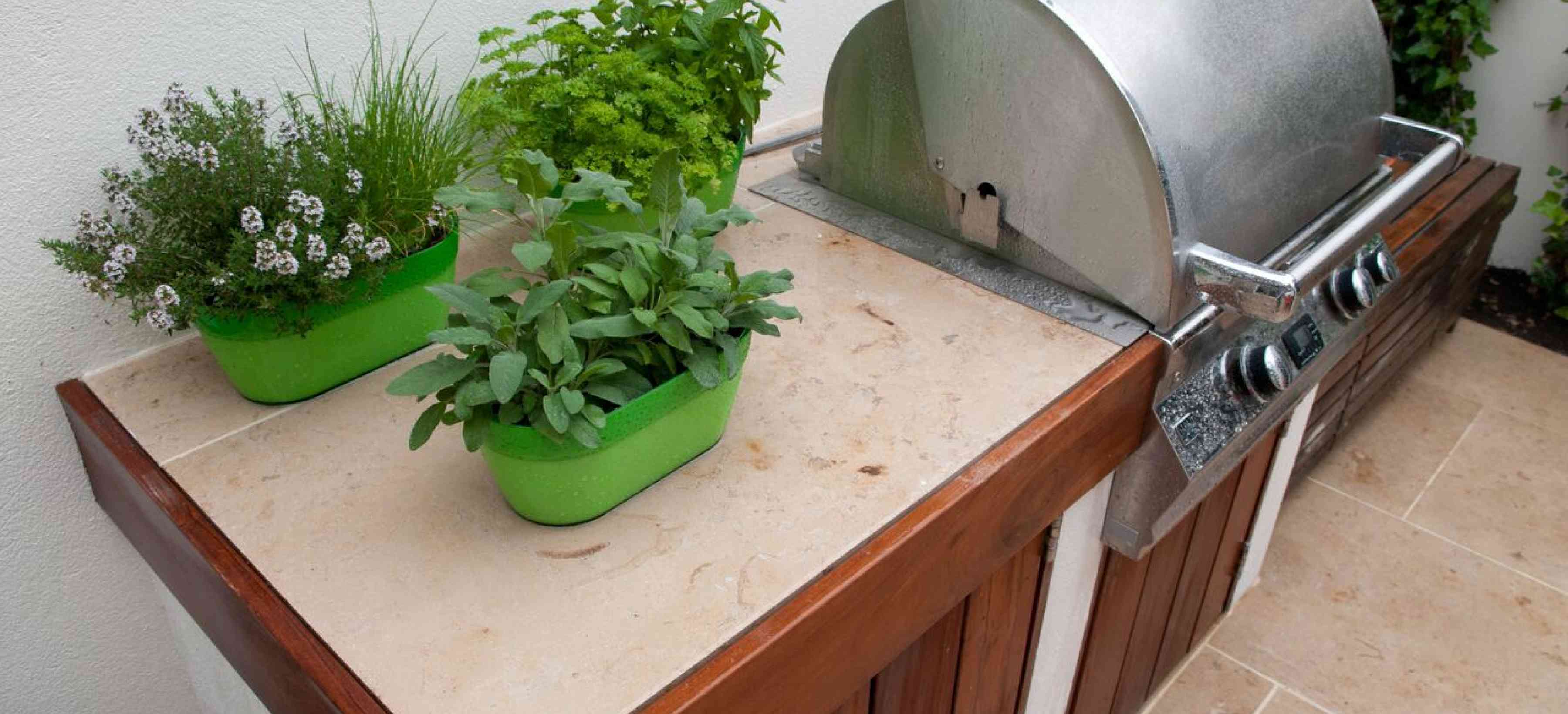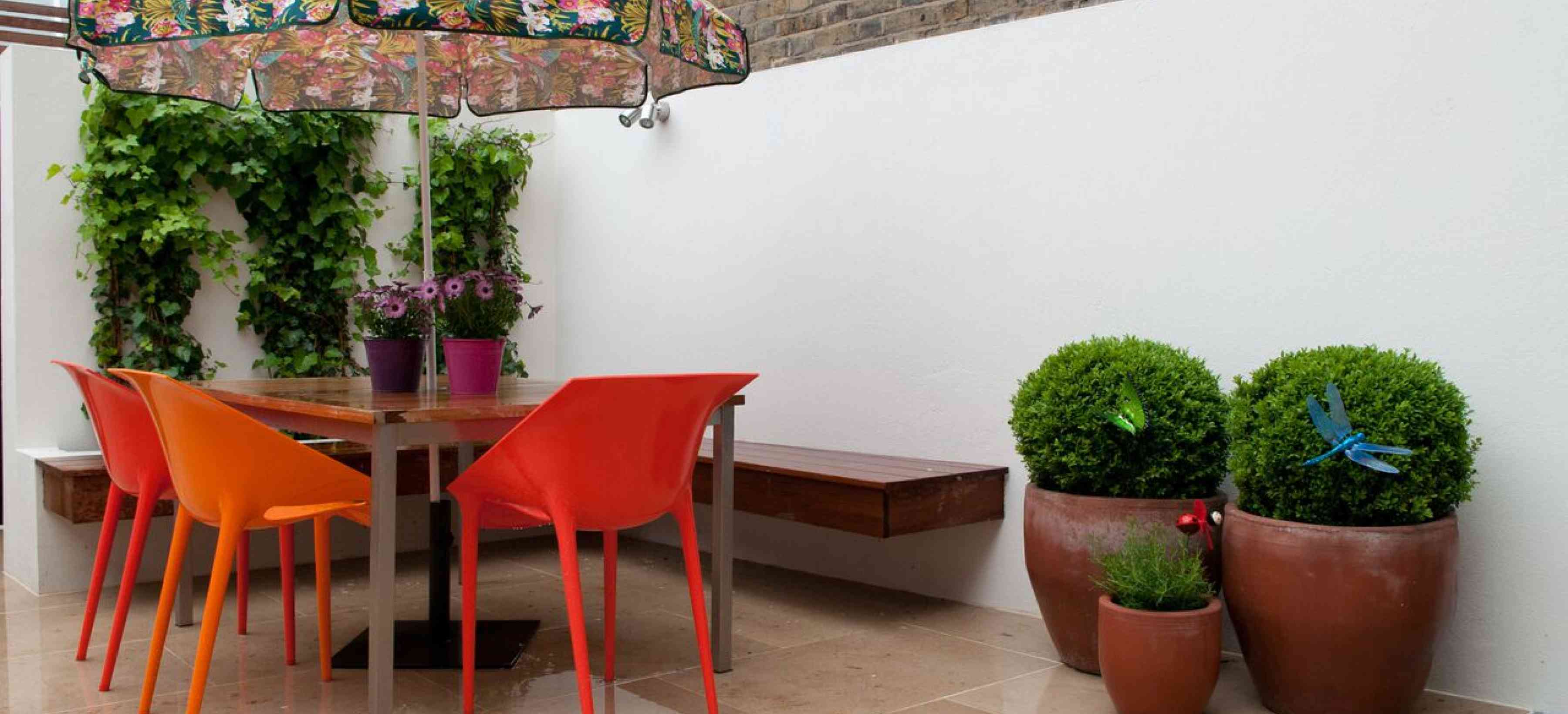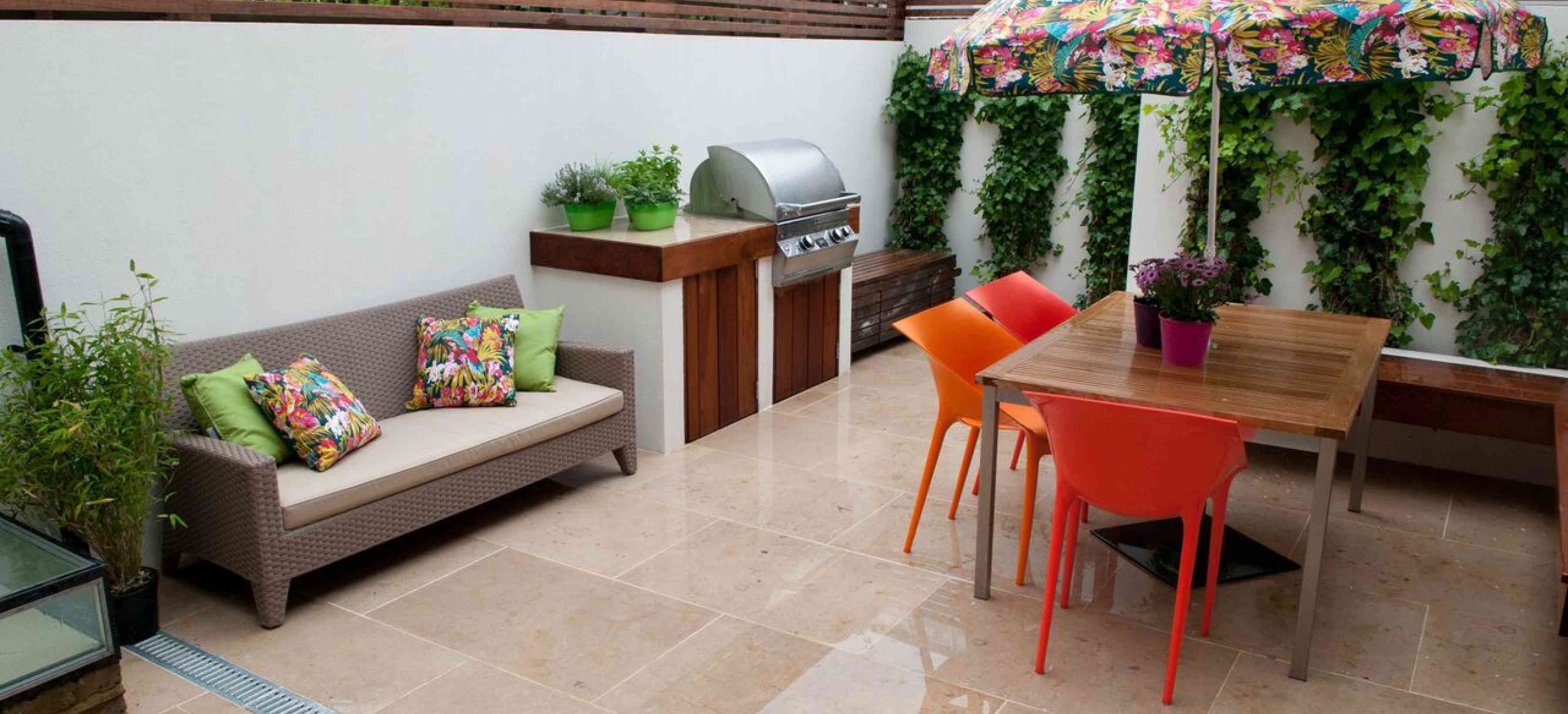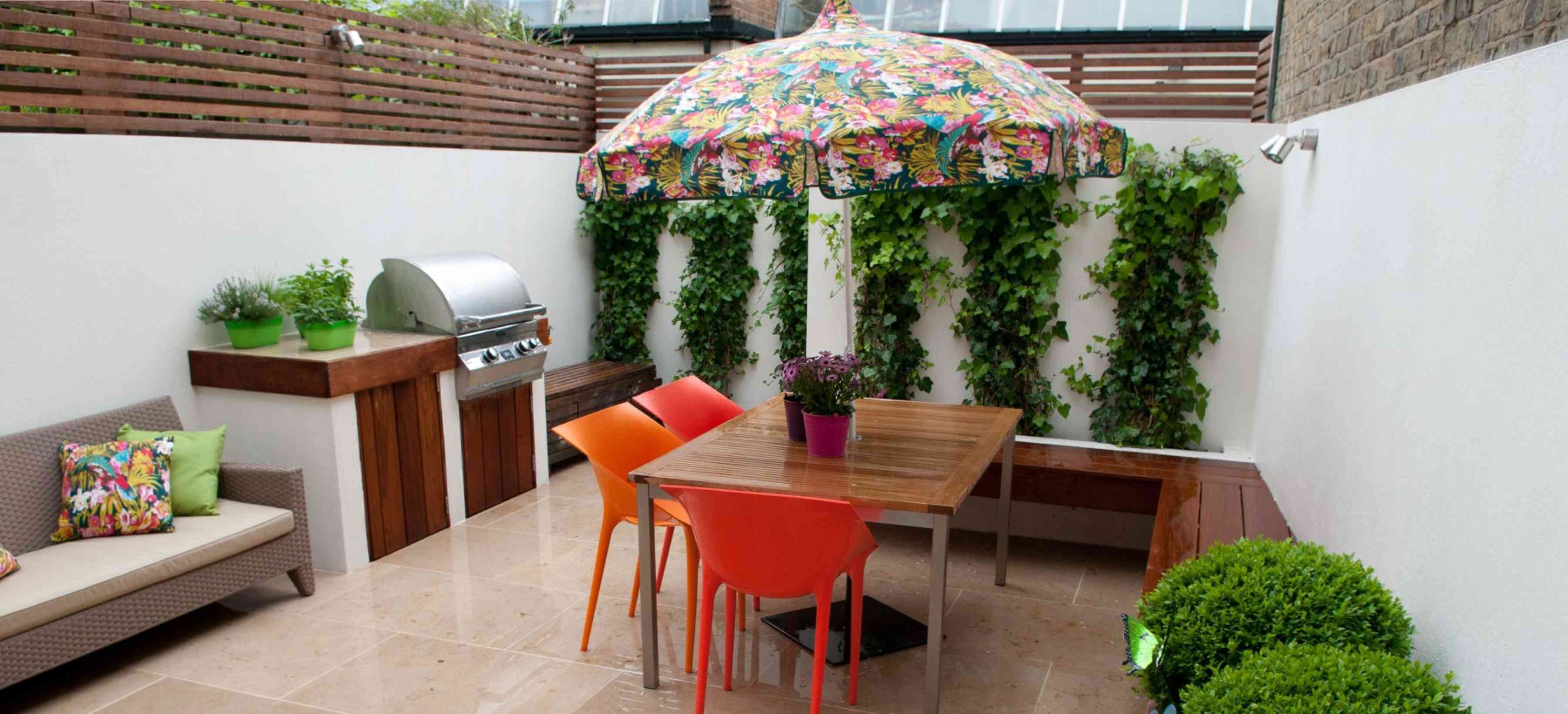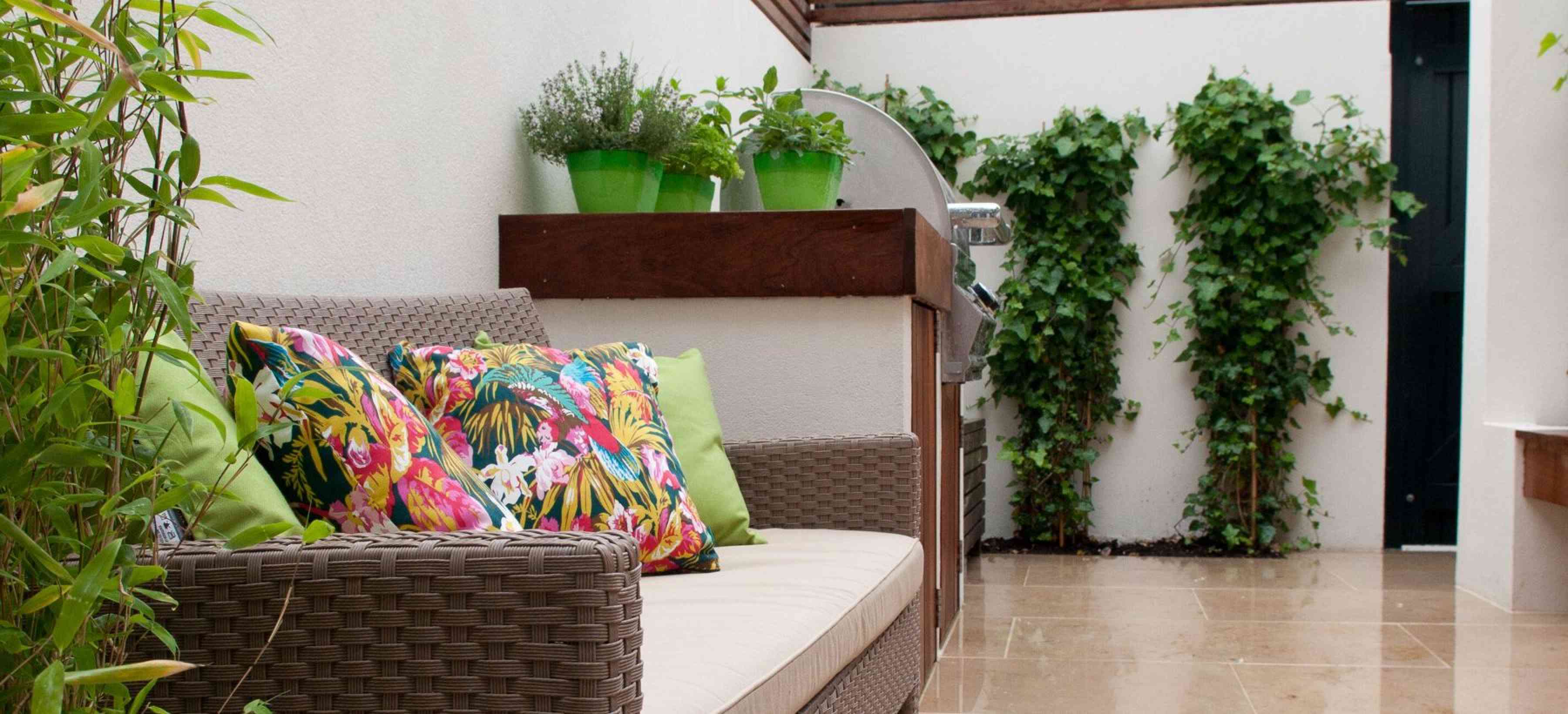It combines Cantilevered benches, sawn Jura paving, a discreet storage area, a new access gate as well as a compact built-in kitchen area with integrated fridge and barbecue – all complimented by a simple, yet strong planting scheme and walls with evergreen climbers.